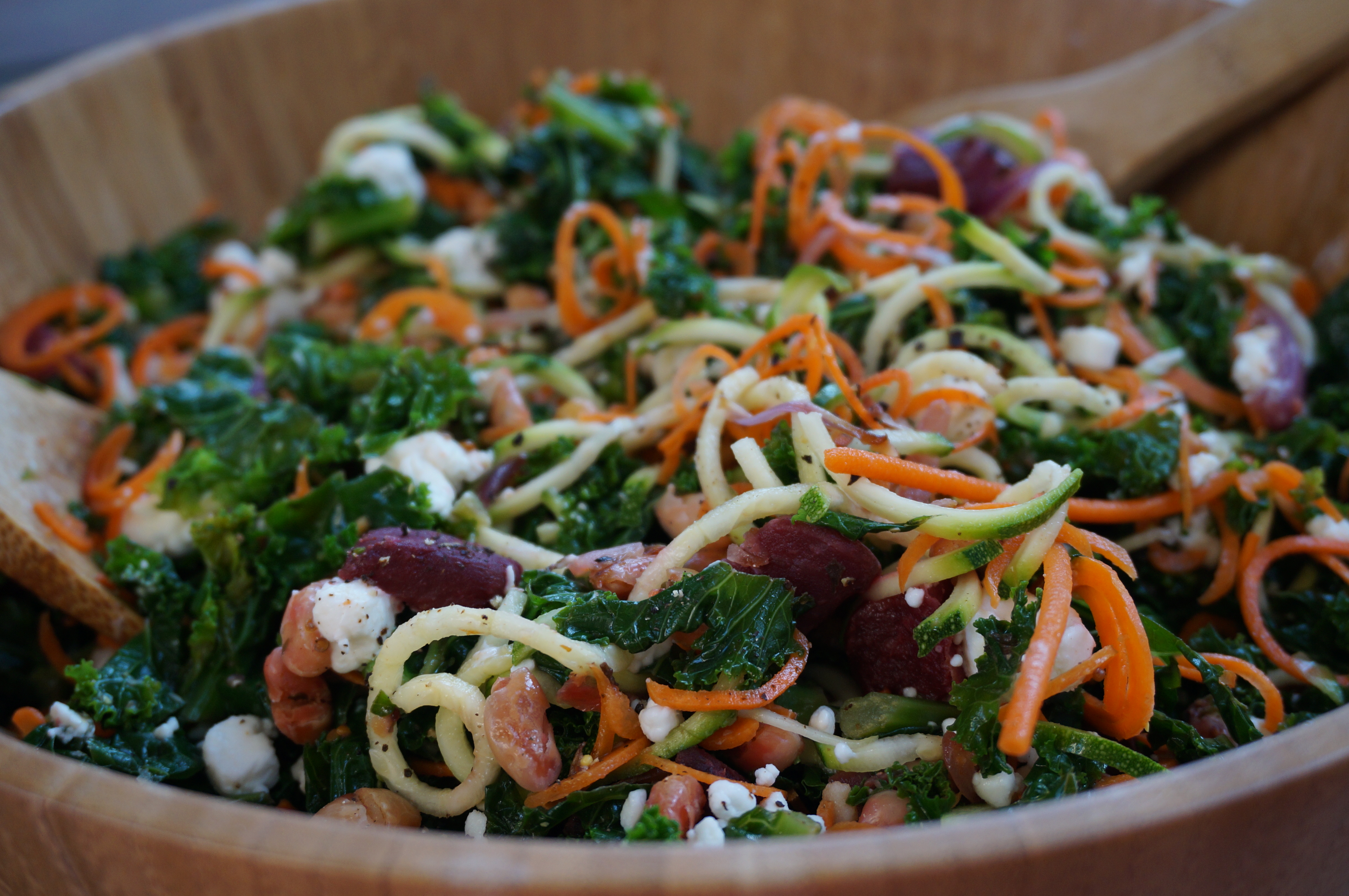 - Combine kale, spiralized veggies, and vinaigrette in a large bowl and toss to combine.
