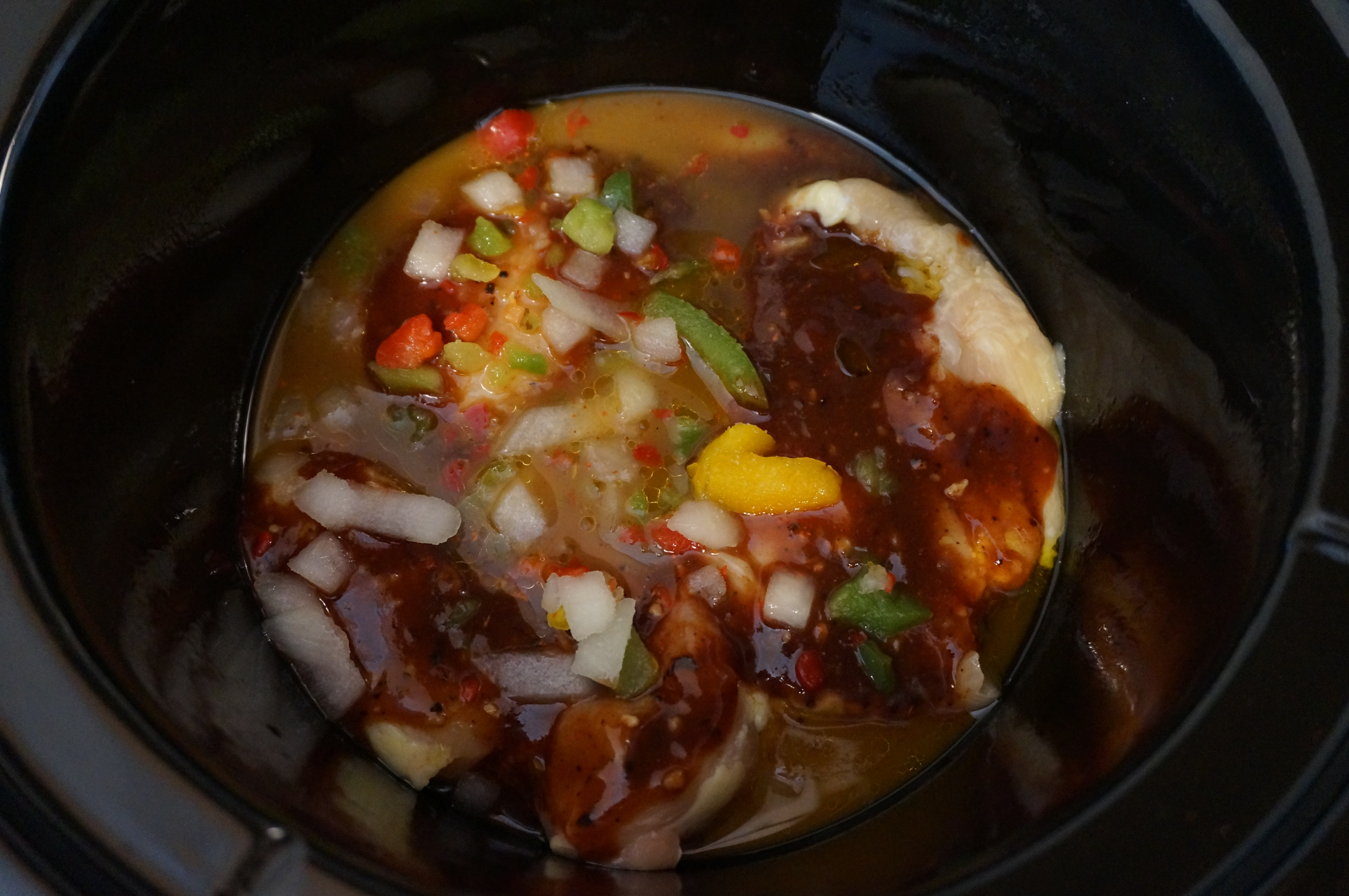 - In a small bowl, stir the mole, ketchup, BBQ sauce, juice of the other 1/2 lime, orange juice, and garlic until thick. Pour over chicken. Add peppers and onions on top.