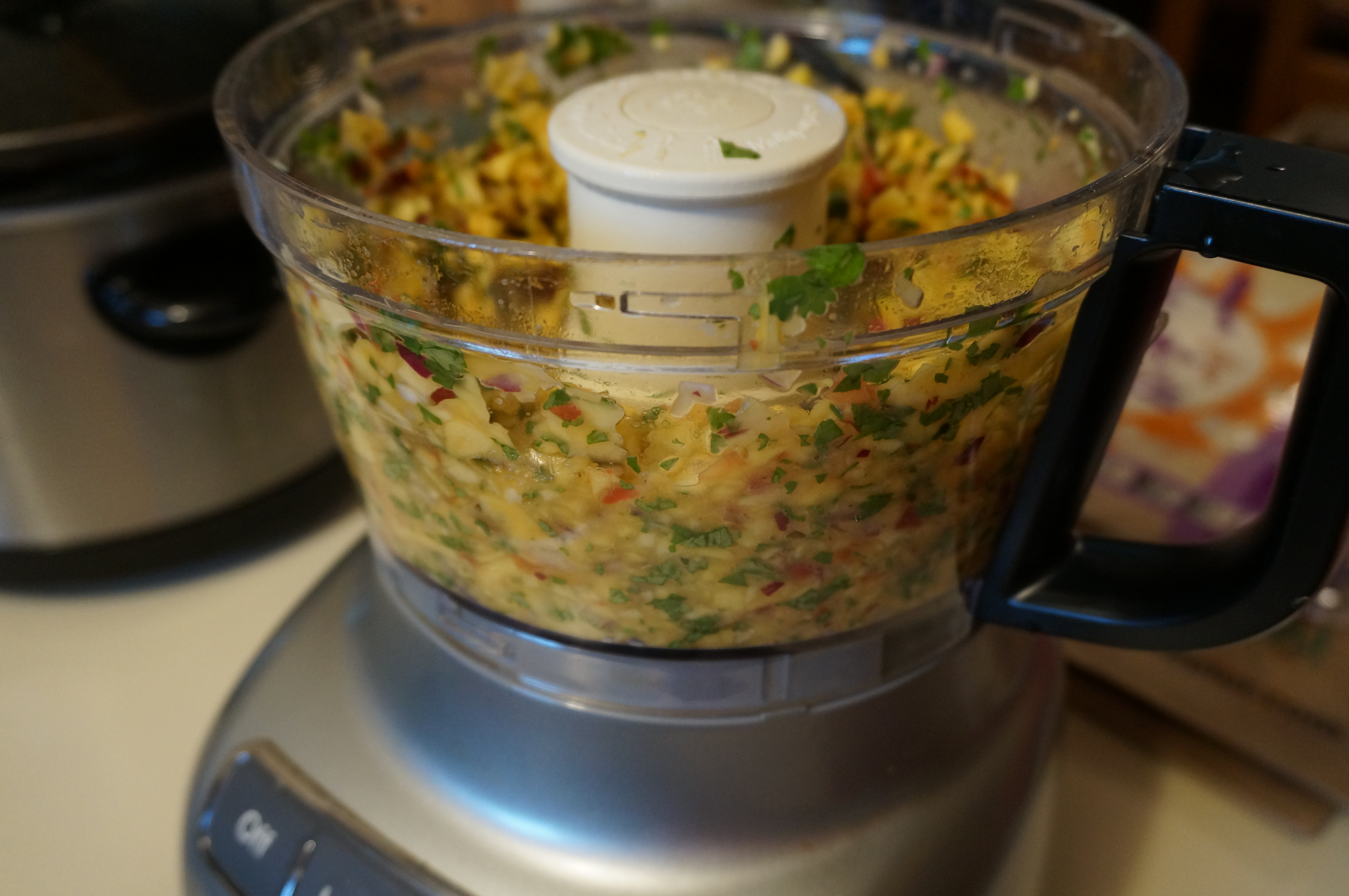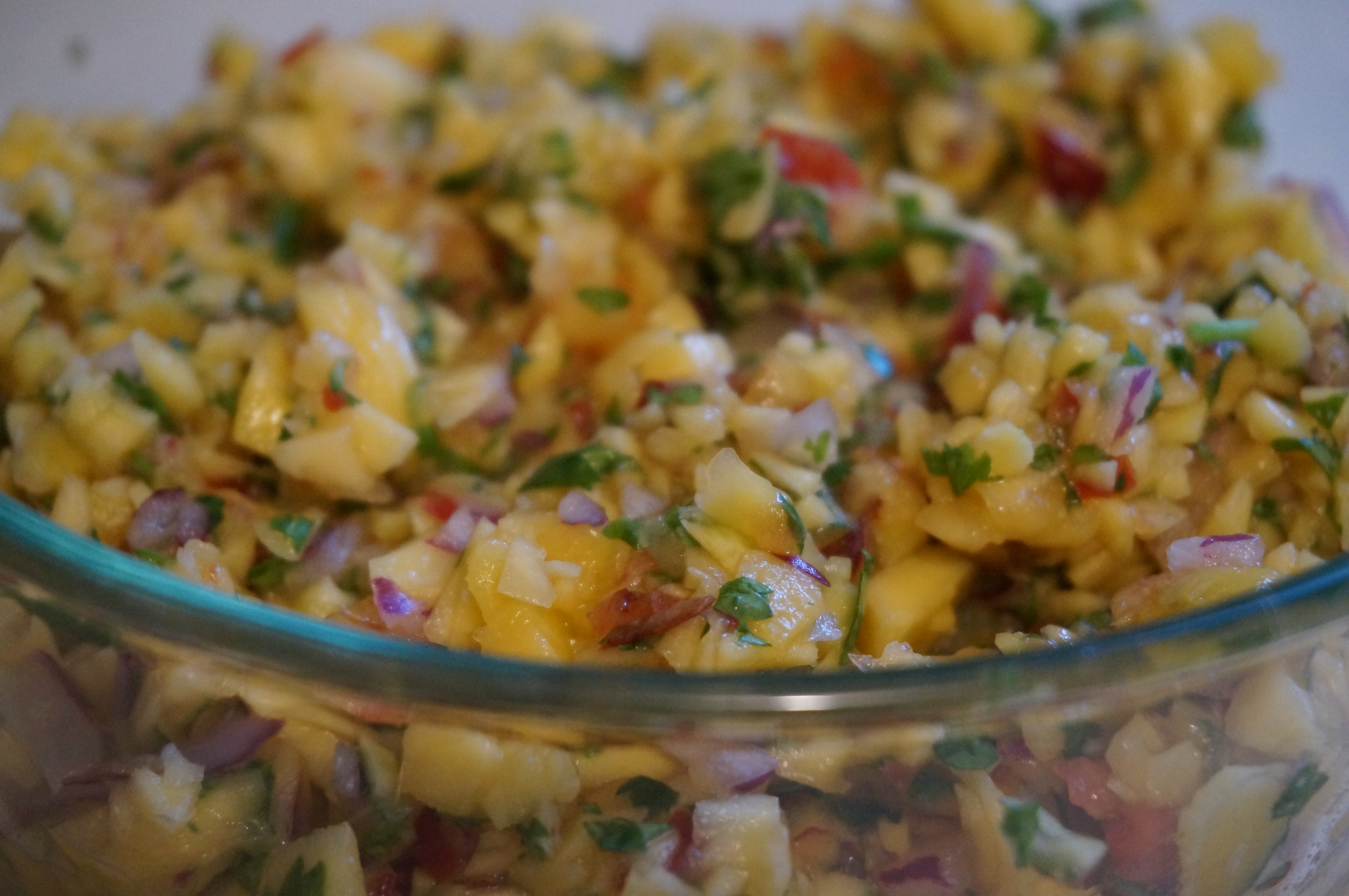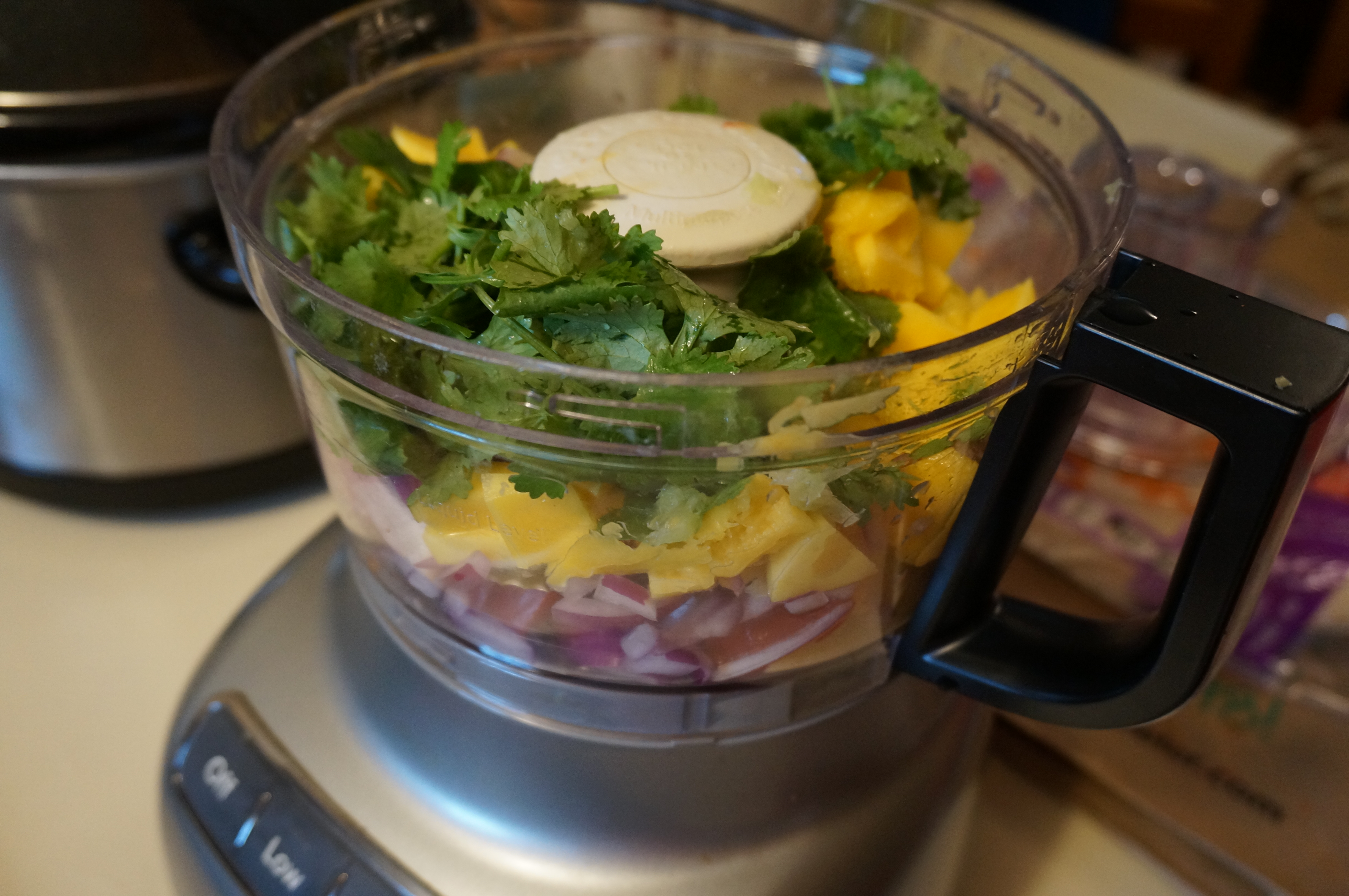 - Slice mango and peach into small chunks. In a food processor, add mango, peach, onion, cilantro, green onion, juice of 1/2 of the lime, and tomato. Pulse a few times until combined- but don’t overdo it! Remove from food processor and refrigerate for at least an hour.