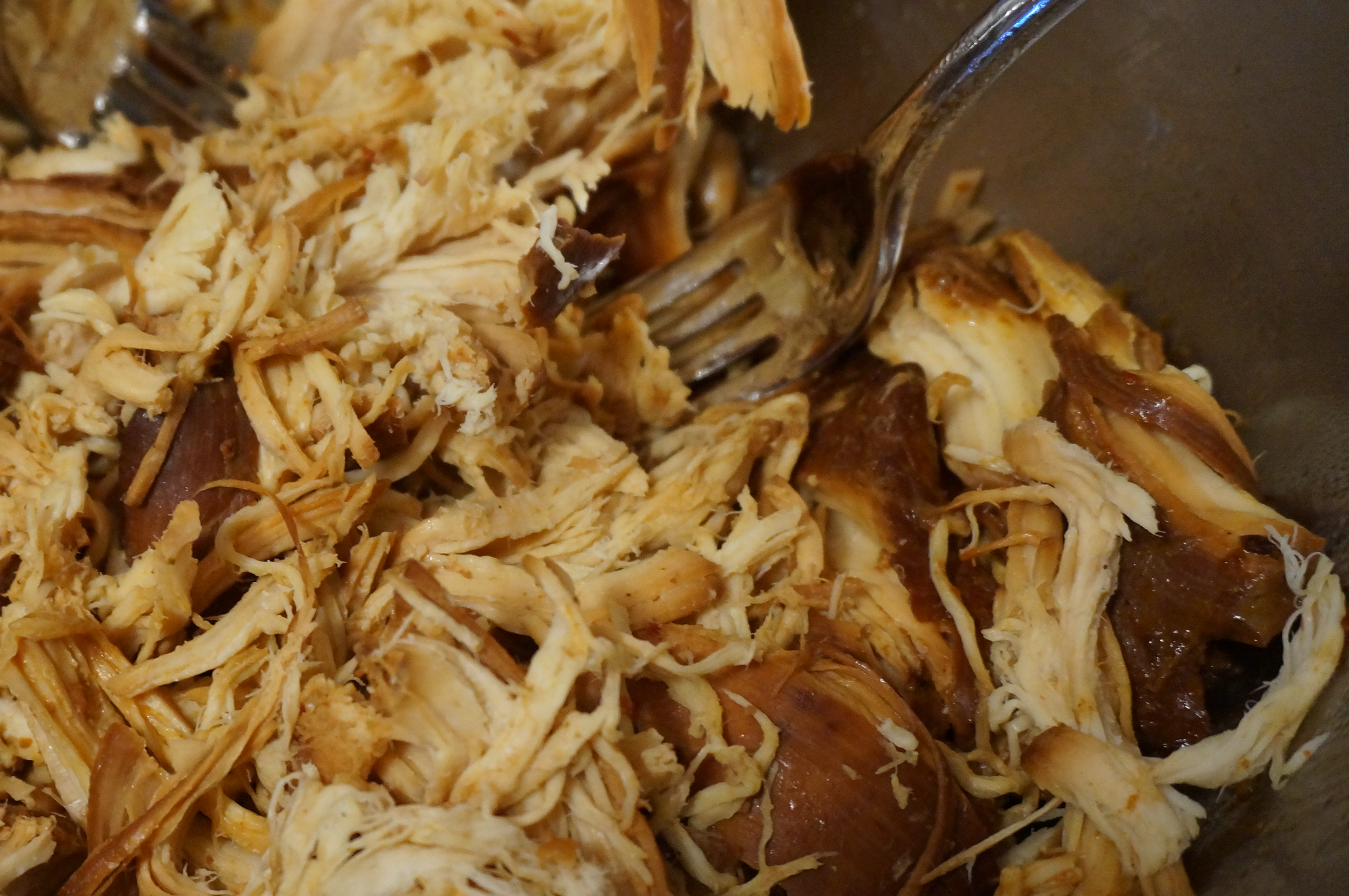 - Remove chicken from crock pot and shred with two forks. Return to the pot for 10 more minutes to allow the juice to marinate the chicken.