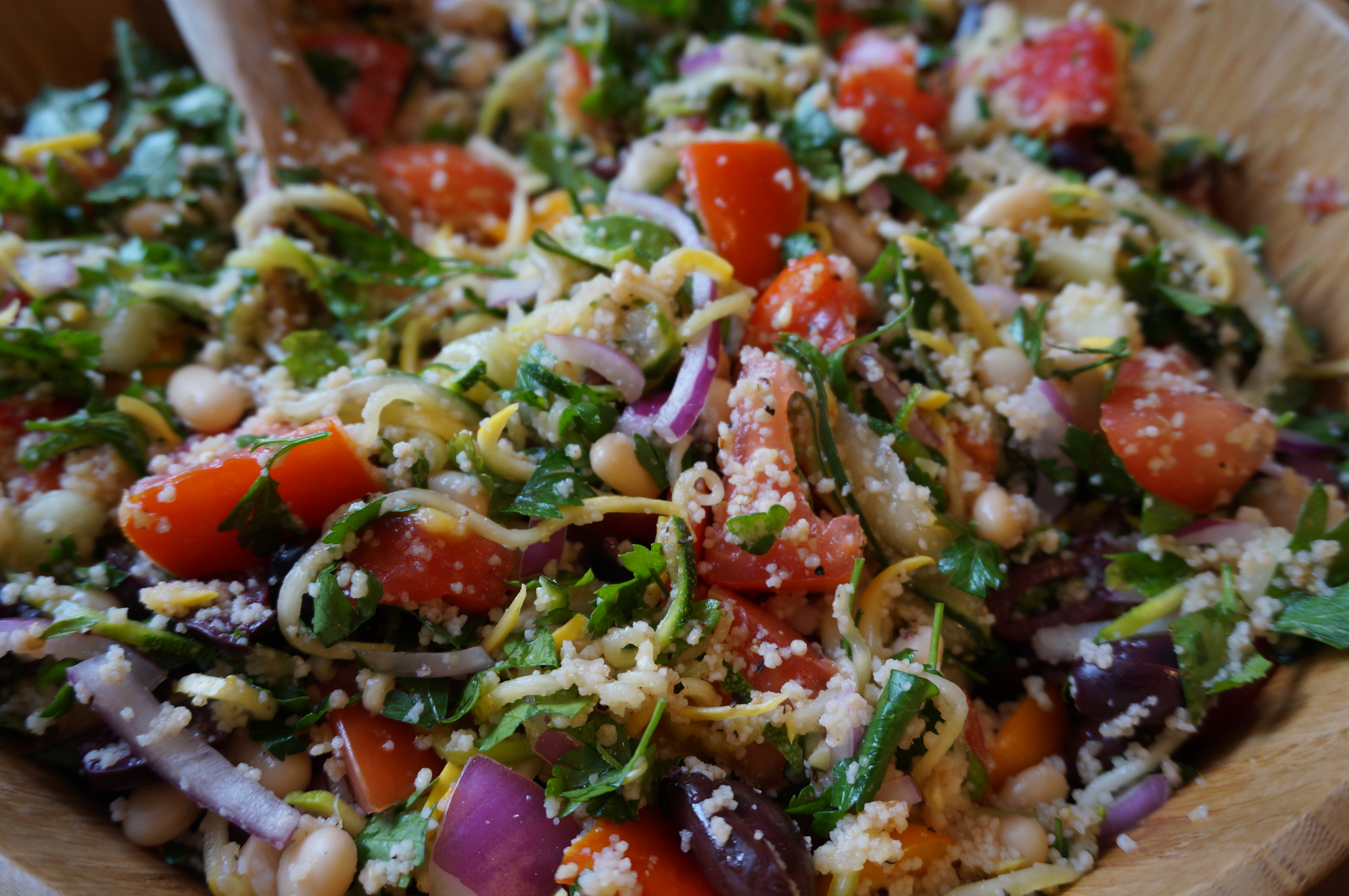Anyway, this salad basically makes itself. When you have fresh, local ingredients that are this ripe and juicy, you really cannot go wrong. I used the same ingredients as the salad at The Boot, except without the basil and I added the white beans into the salad to begin with. I also added some squash and couscous to add some bulk and soak up the extra dressing. This could be enjoyed as a side or a main dish with some chicken on top (or poached egg, for vegetarians). I also recommend serving with feta and pita wedges!
