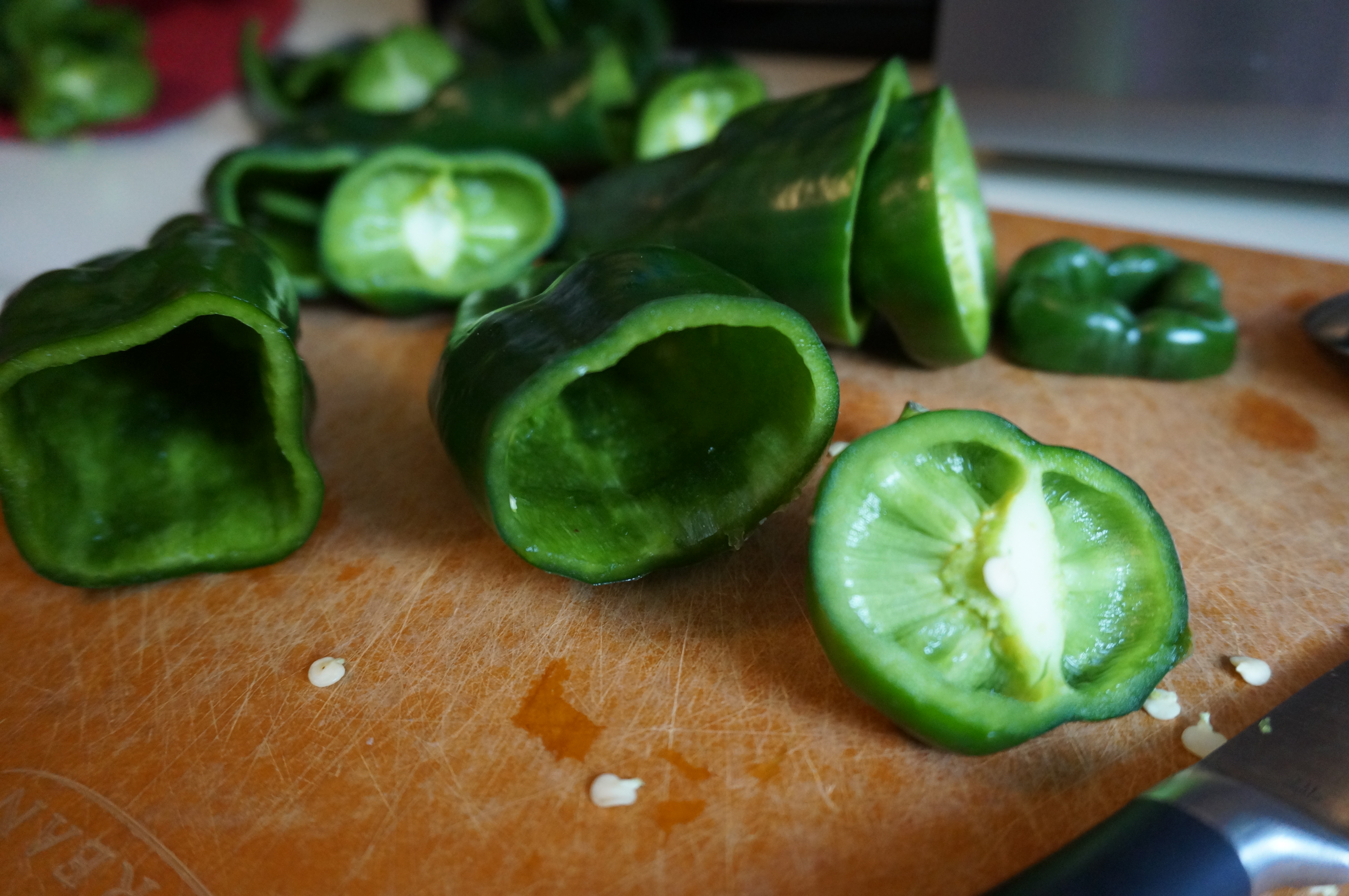 - Slice stem tops off of each pepper and remove seeds and core from the insides. (Make sure to keep track of which top goes with which pepper!)