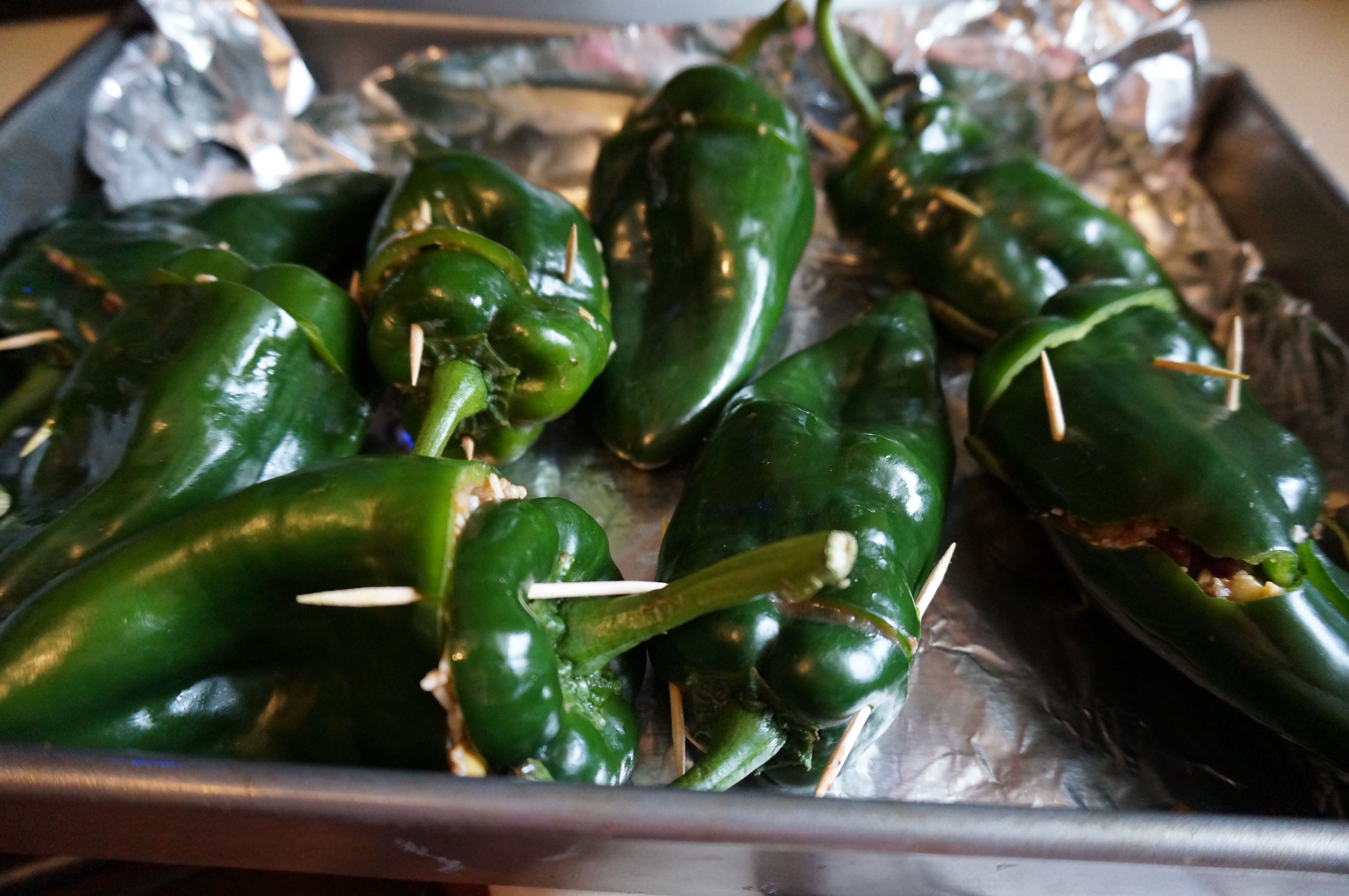 - Stuff peppers with filling and secure stems back on top with two toothpicks.