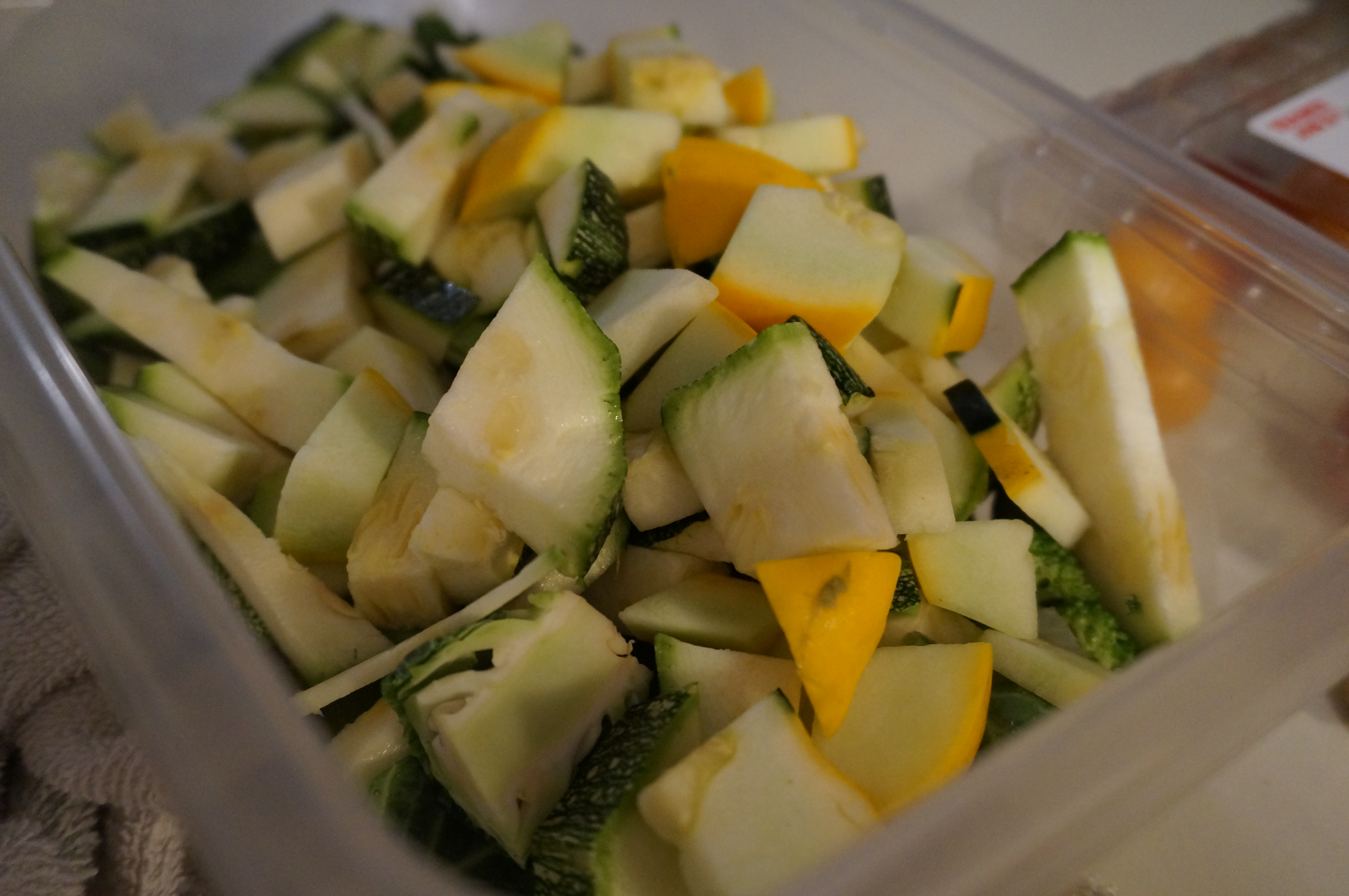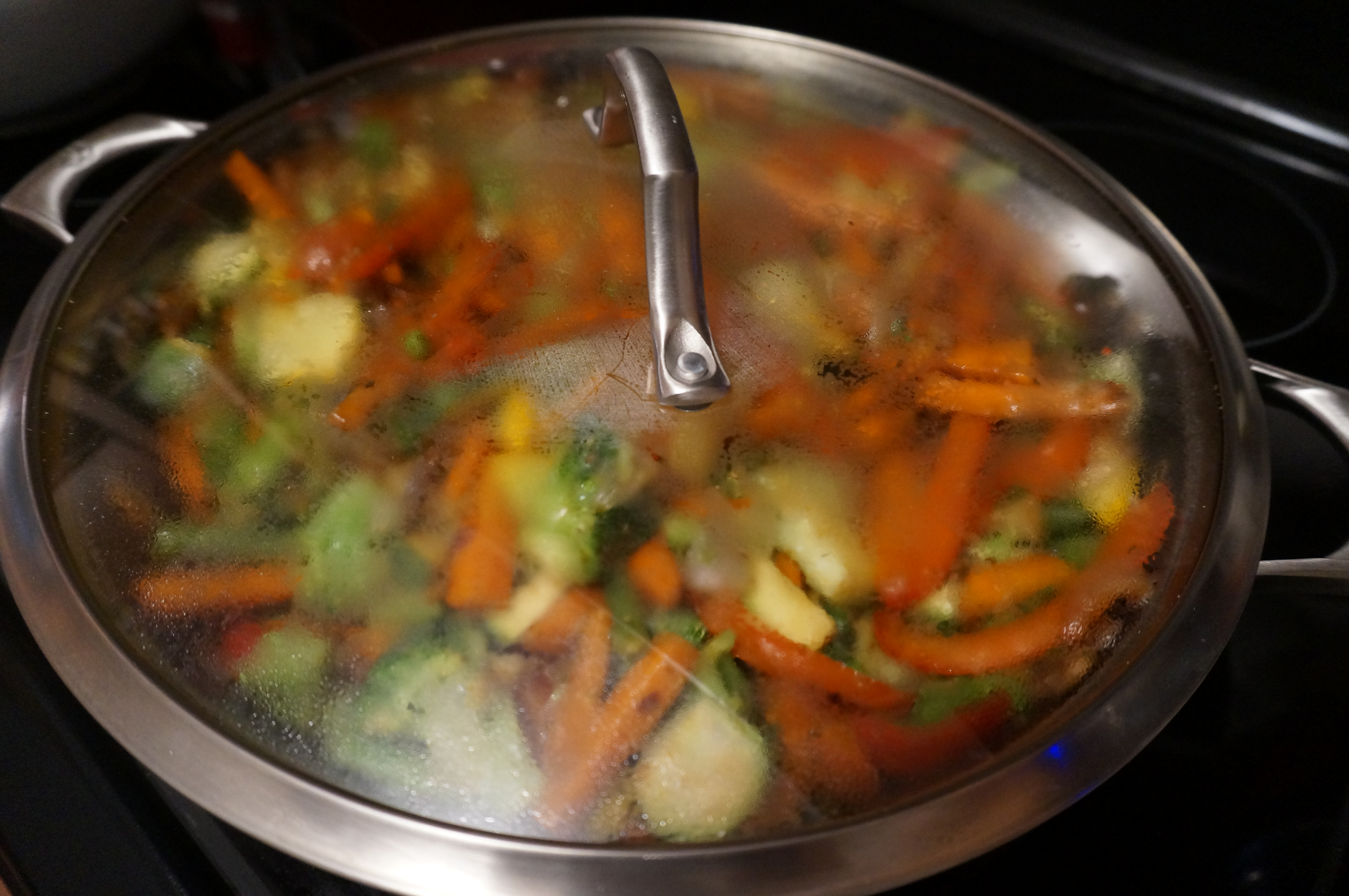 - Chop zucchini and squash. Add to same pan with the frozen veggies. Cook on medium heat for 3-4 minutes until tender but not cooked fully.