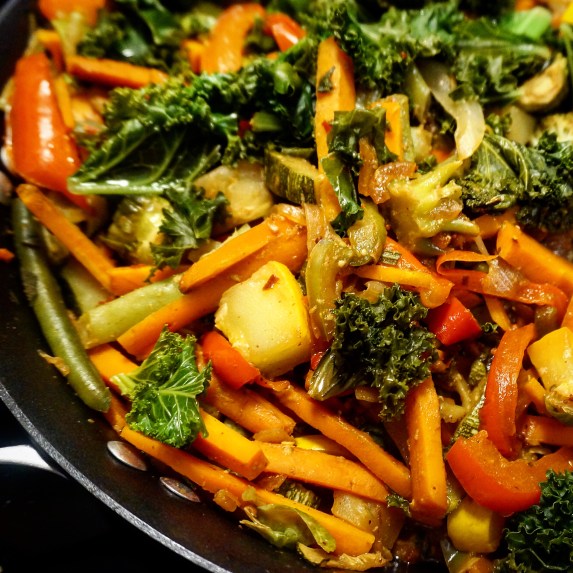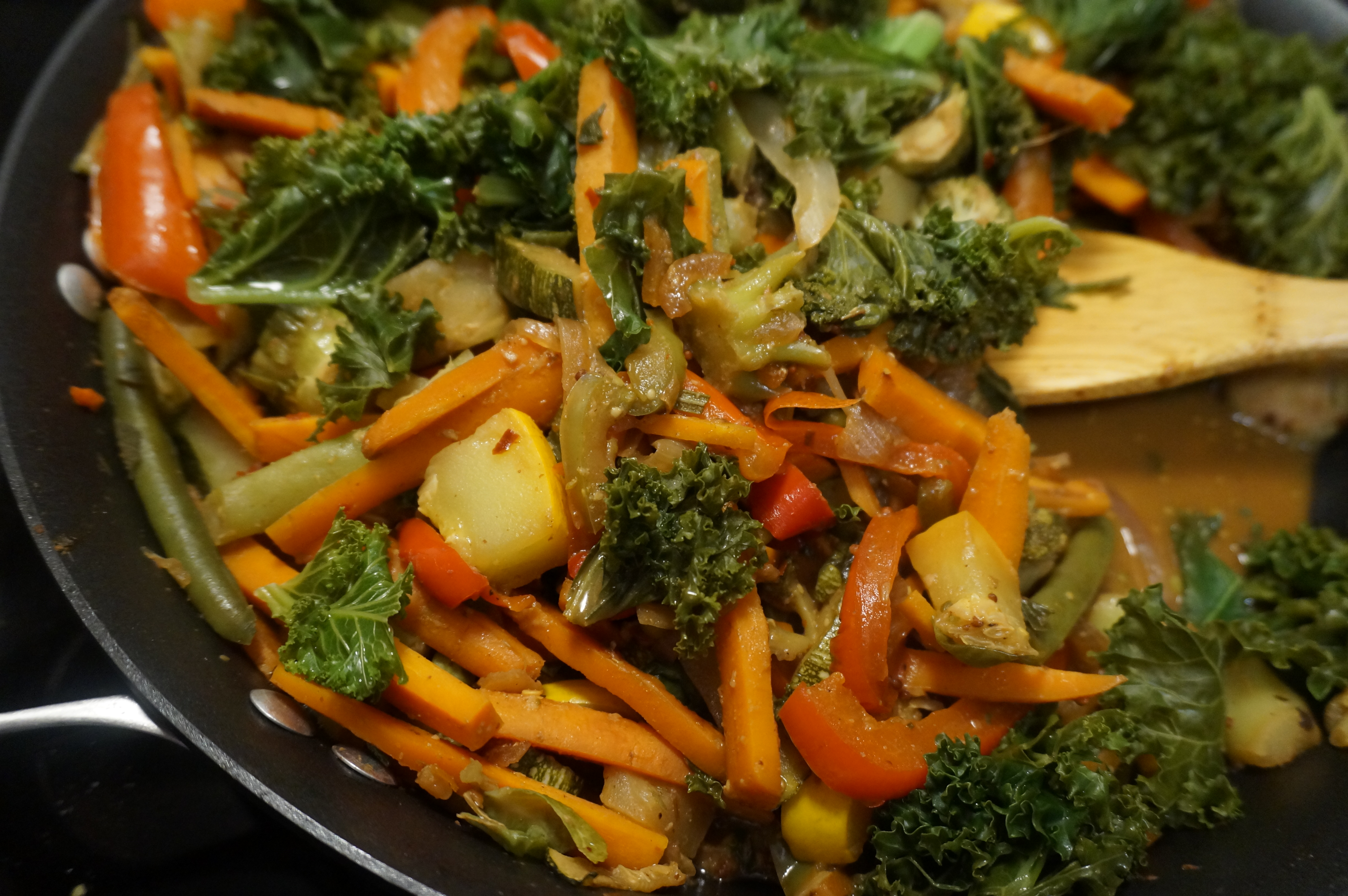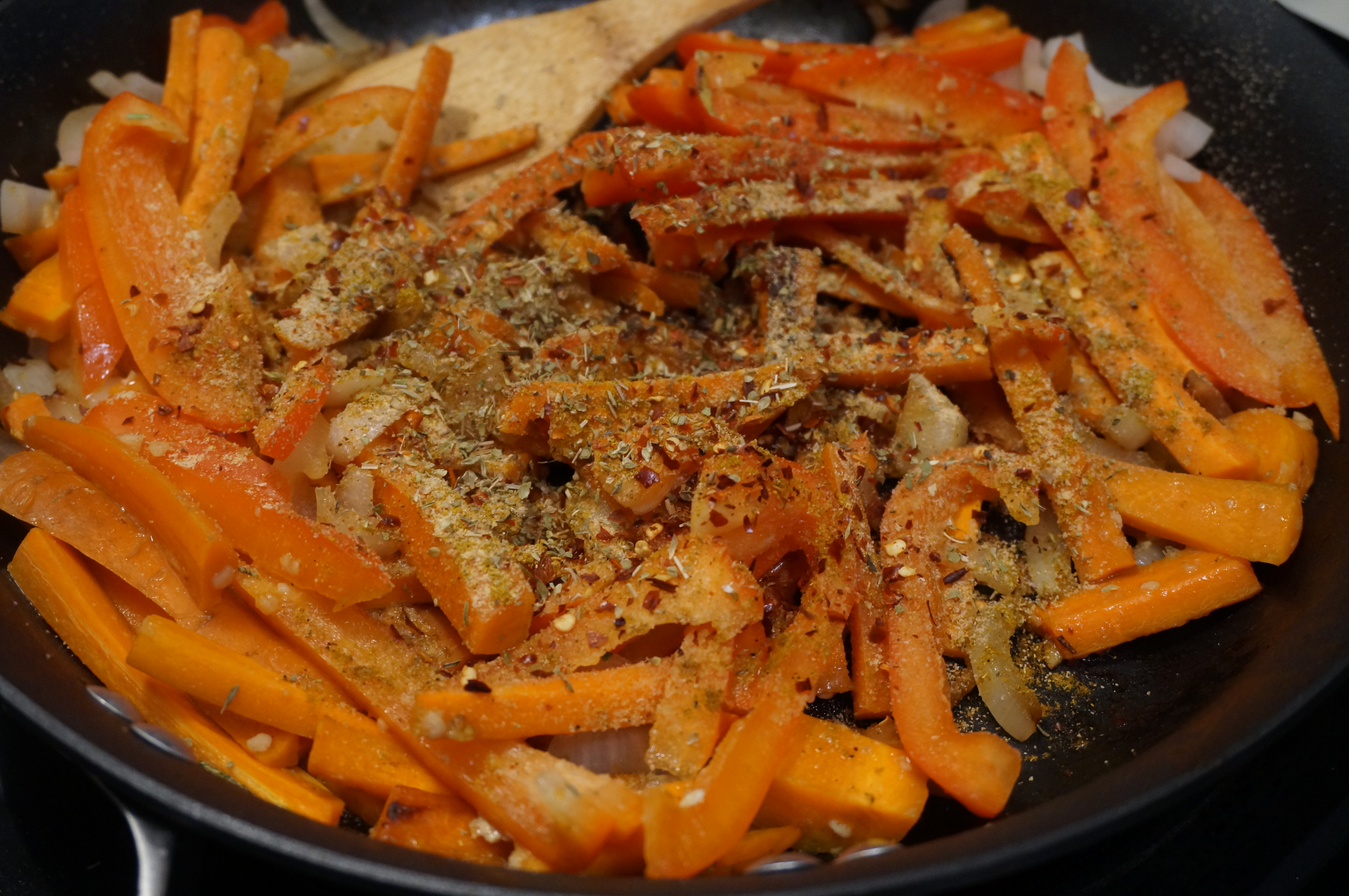 - In a large wok or saute pan, heat olive oil on medium heat. Add red pepper, carrots, onion, and garlic and cook until tender, about 4 minutes. Sprinkle in the ginger, oregano, curry powder, and garlic powder. Remove from pan and set aside.