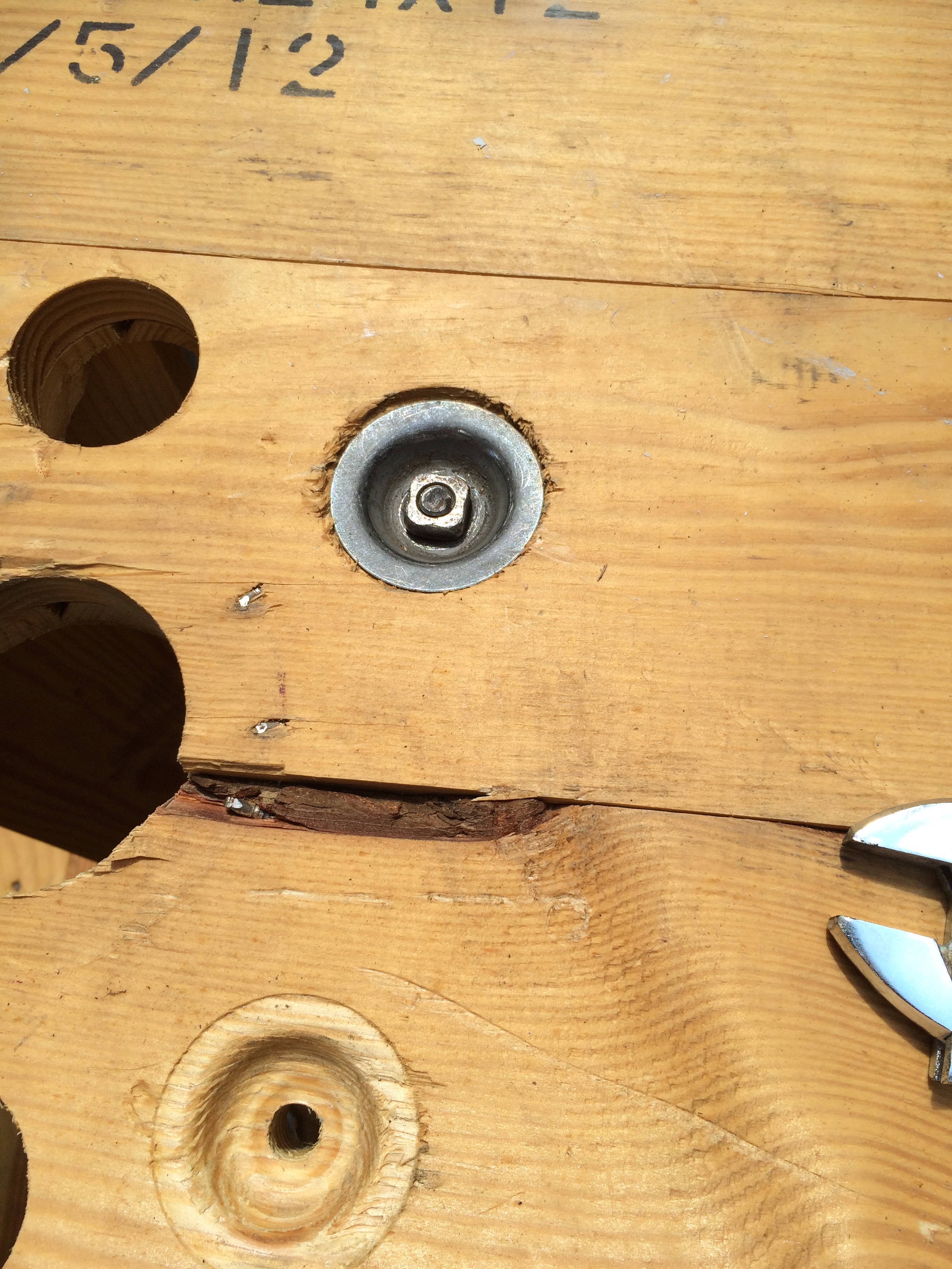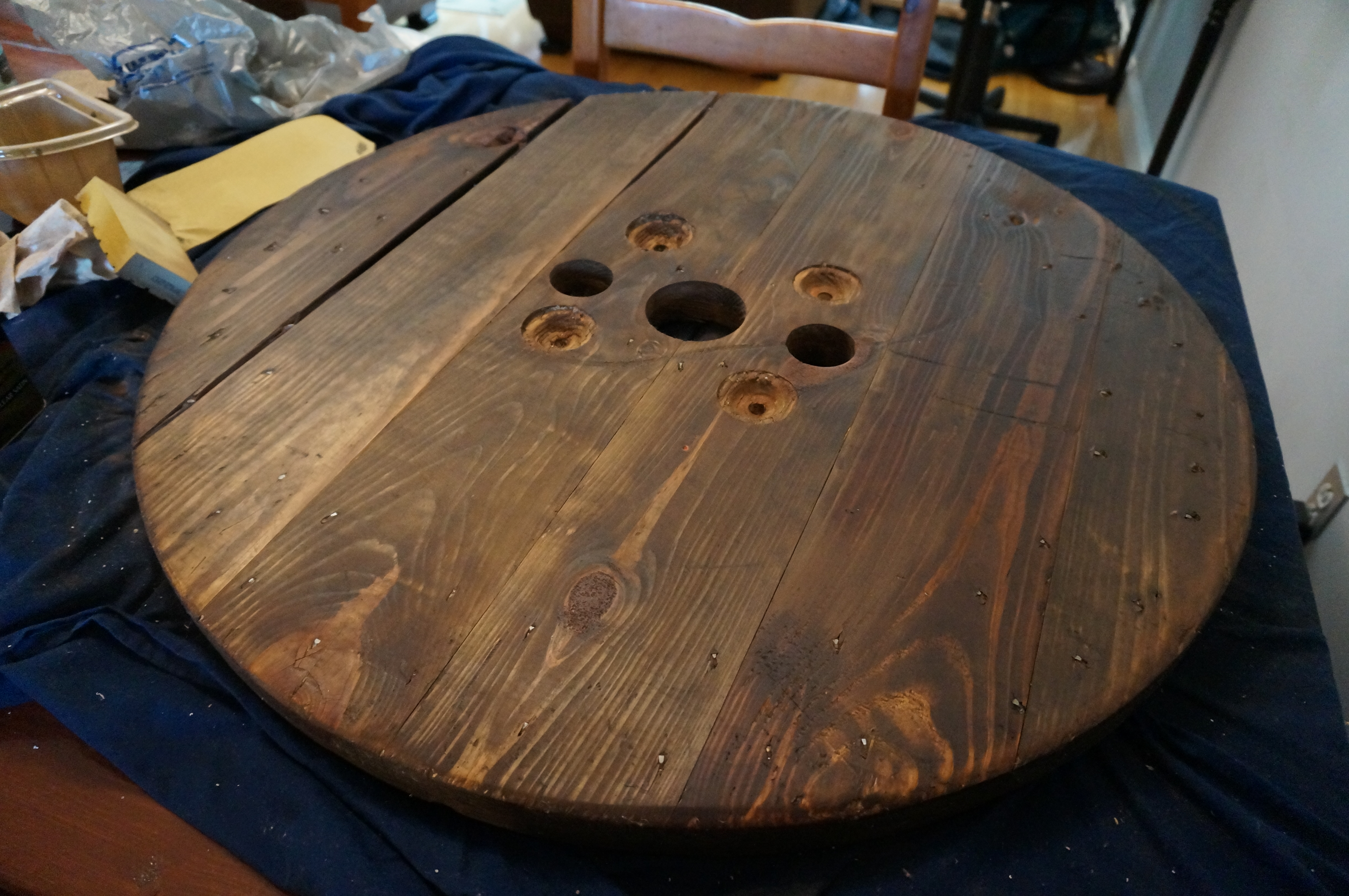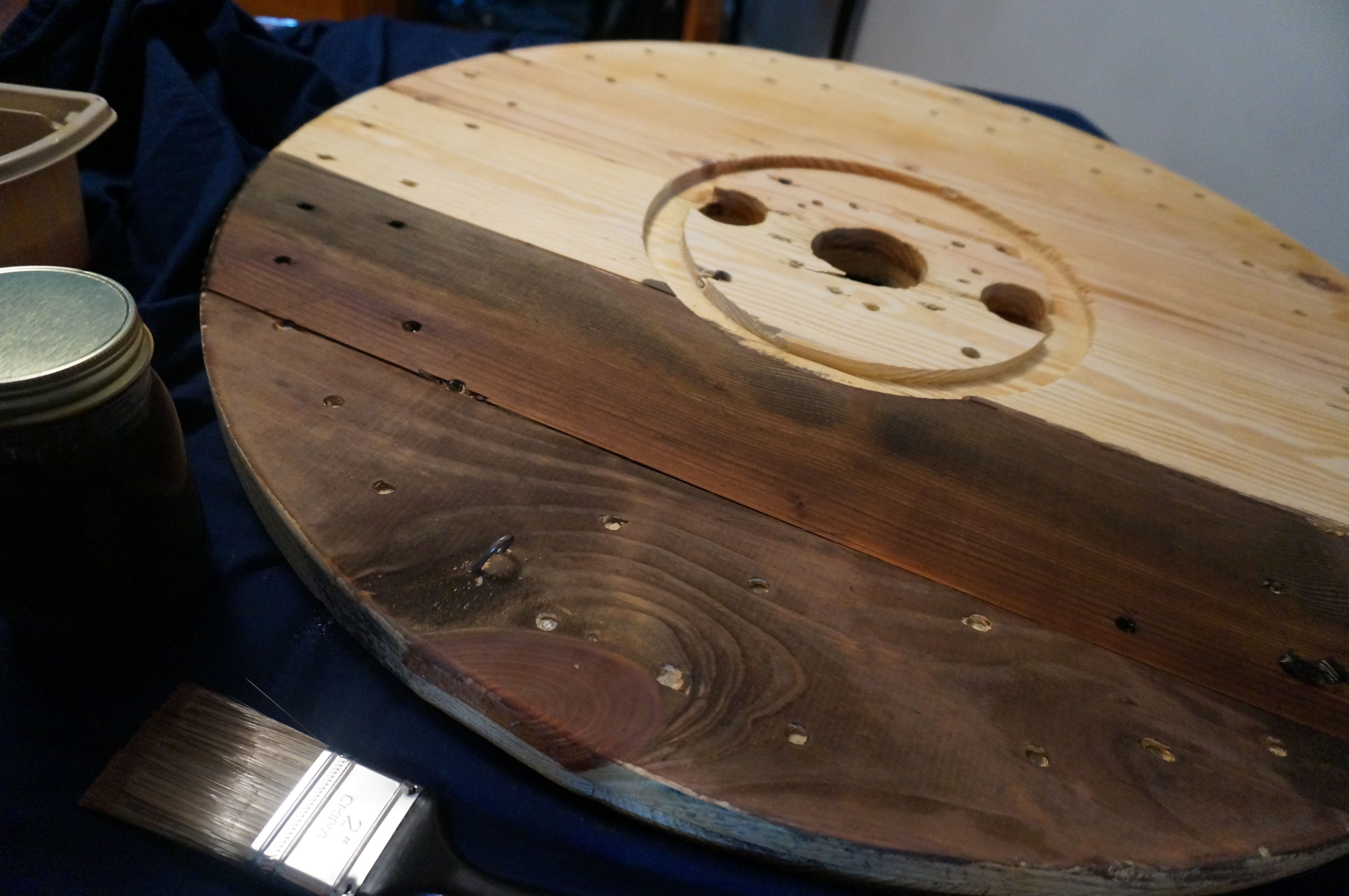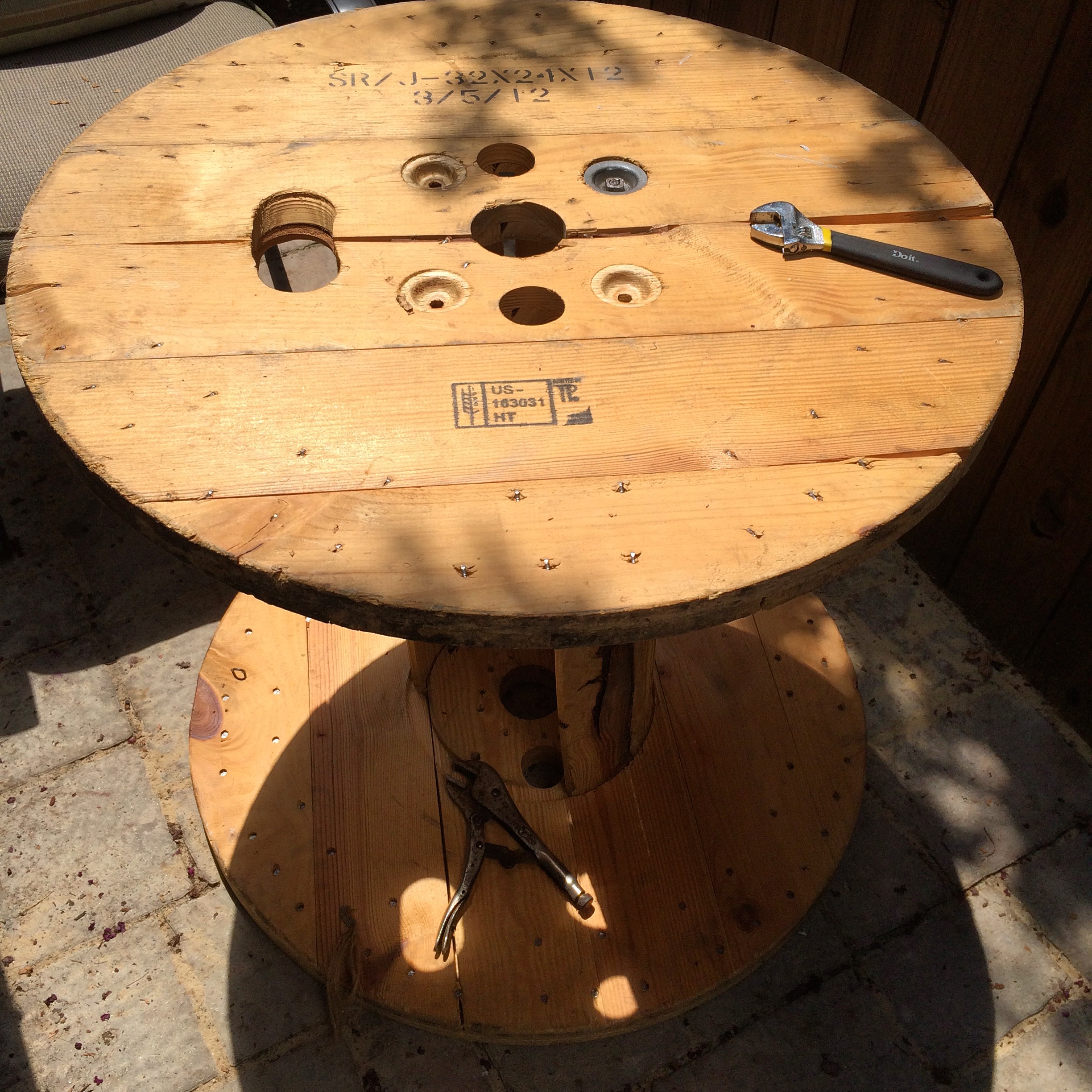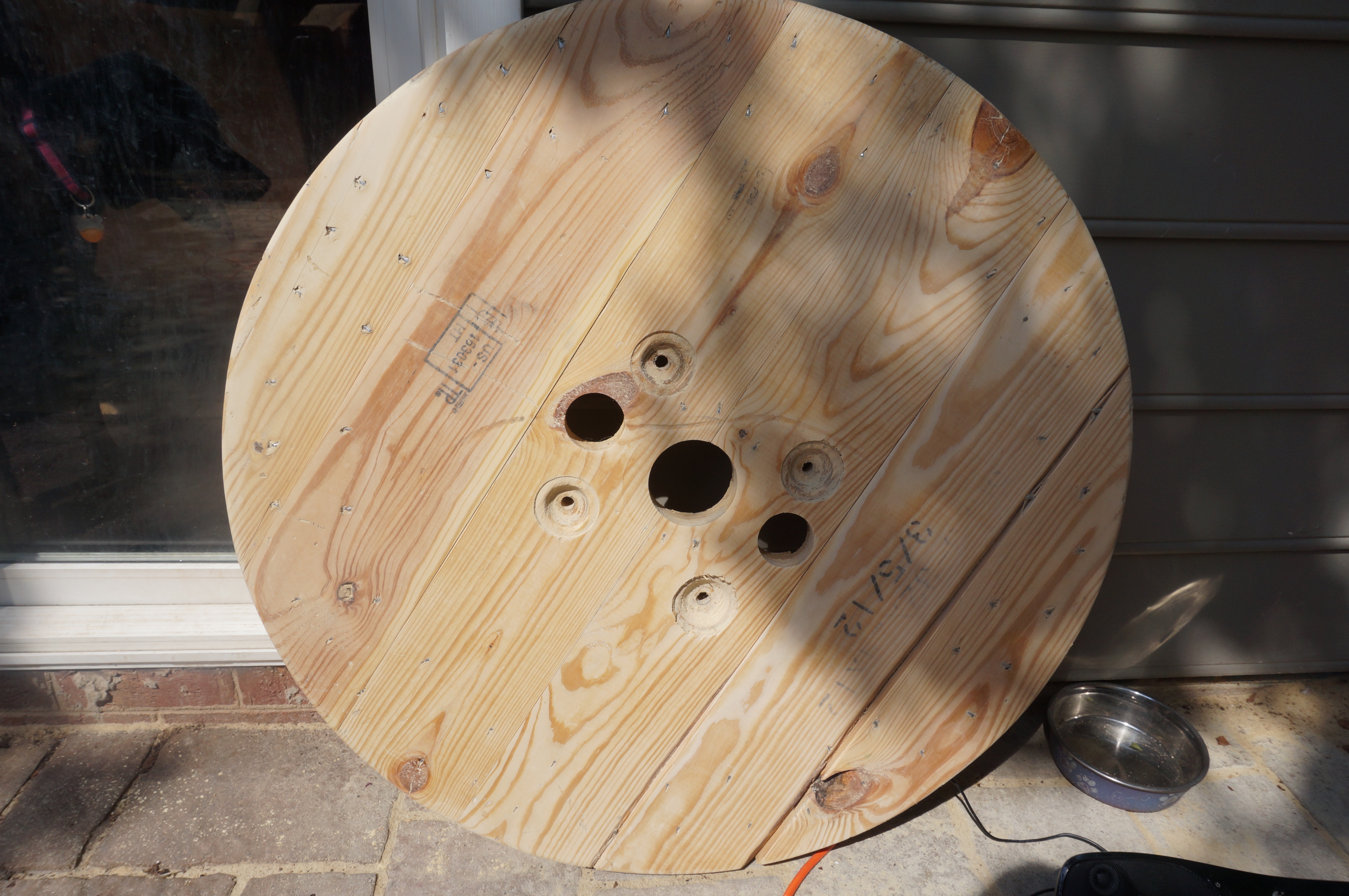 Pictured above is the original spool pallet I used. I set to work removing the huge bolts from the side with the better quality wood. I think I chose the hottest day of the summer for this…