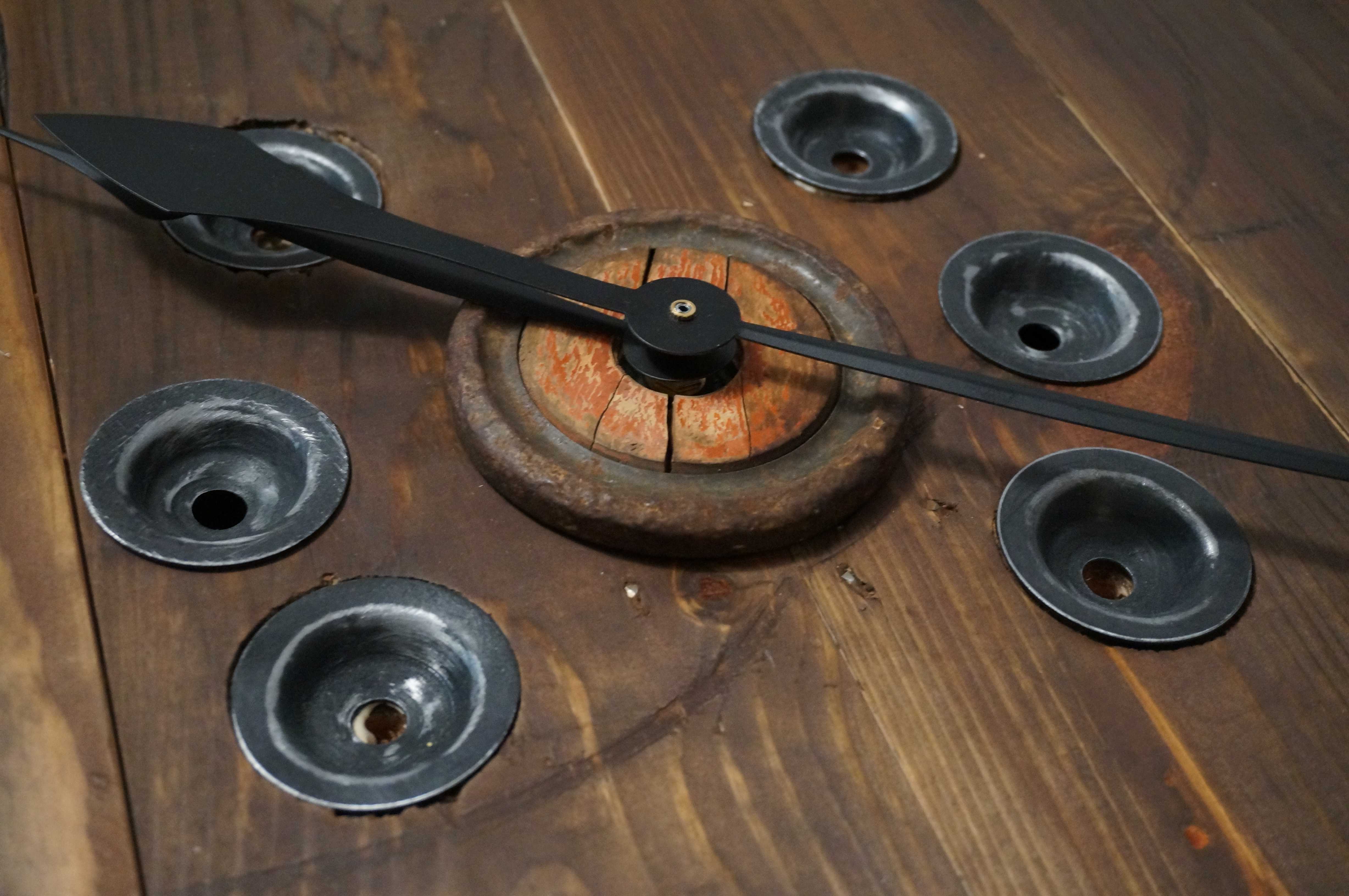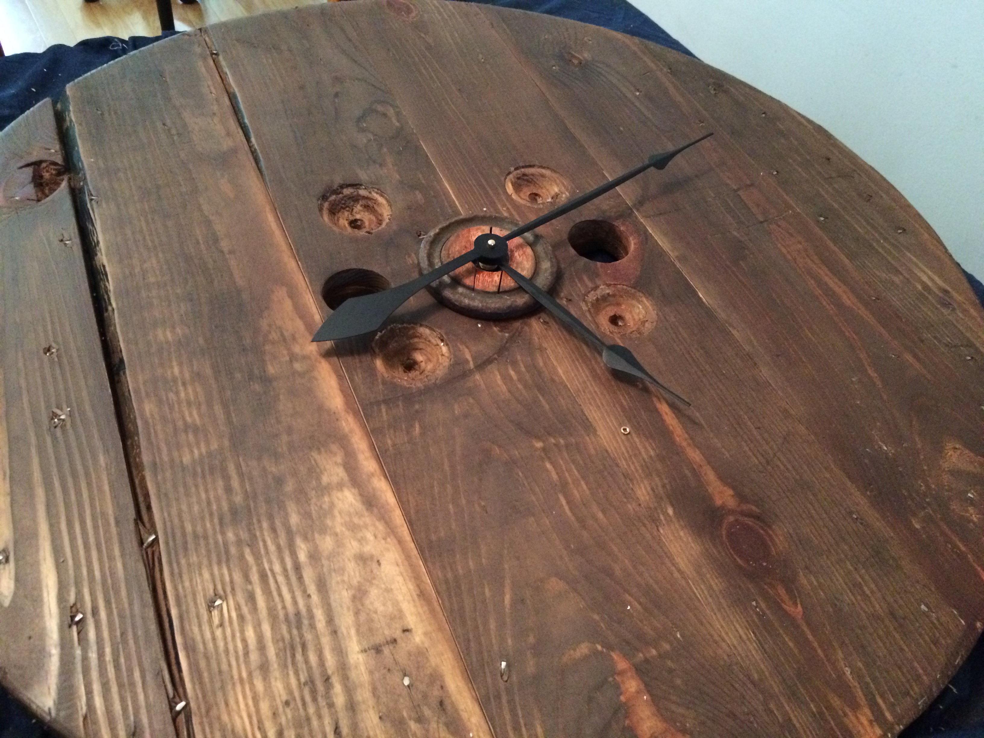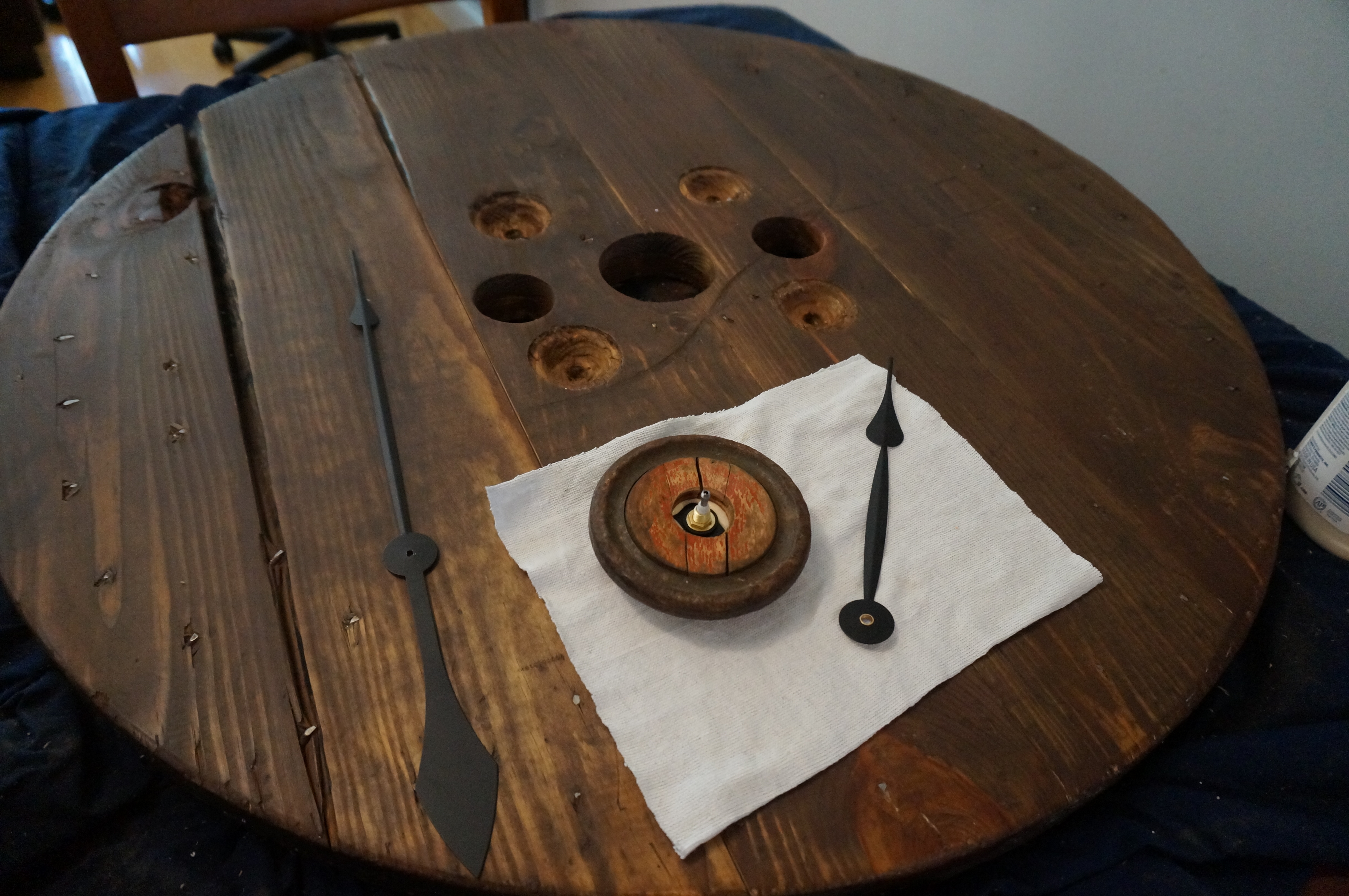 I removed one of the sides from the spool (I chose the side with the red paint remnants and a few cracks) and decided not to do anything to the piece to keep it in its original form. I glued the clock motor to the back of it and set it in the center of the clock before assembling the hands.