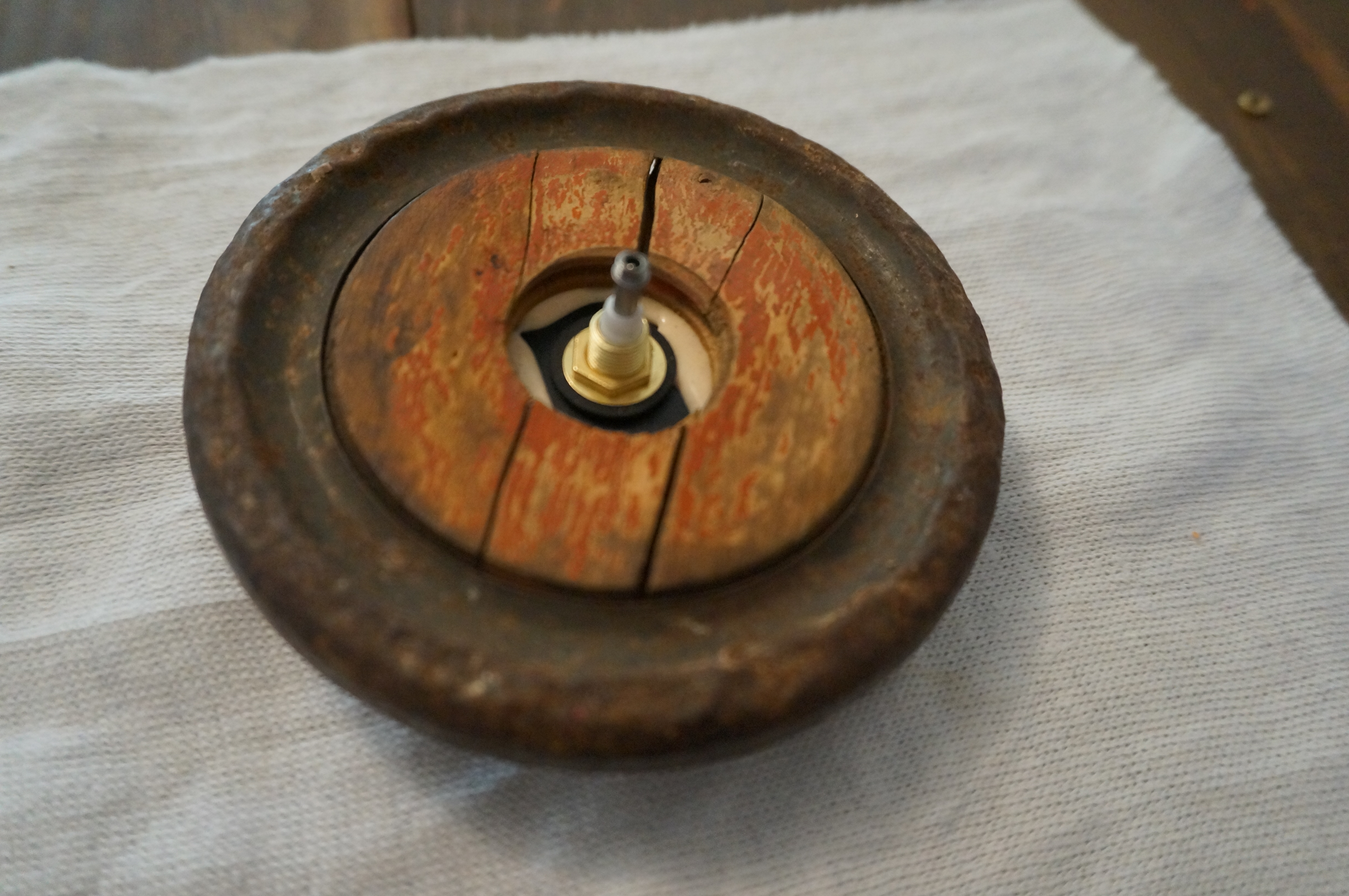 Note to self: when looking for something specific at an antique shop, you probably will never find it. I had to broaden my vision for this since no one had any wheels (except a brass ships’ wheel that was huge and would’ve added about 20 lbs to this clock). I began to look for other circular things with a hole in the middle for the motor to insert. I finally found this piece at Hillsborough Antiques Mall and decided it would do the trick. Plus, I couldn’t turn it down because it was so neat! Any guesses?