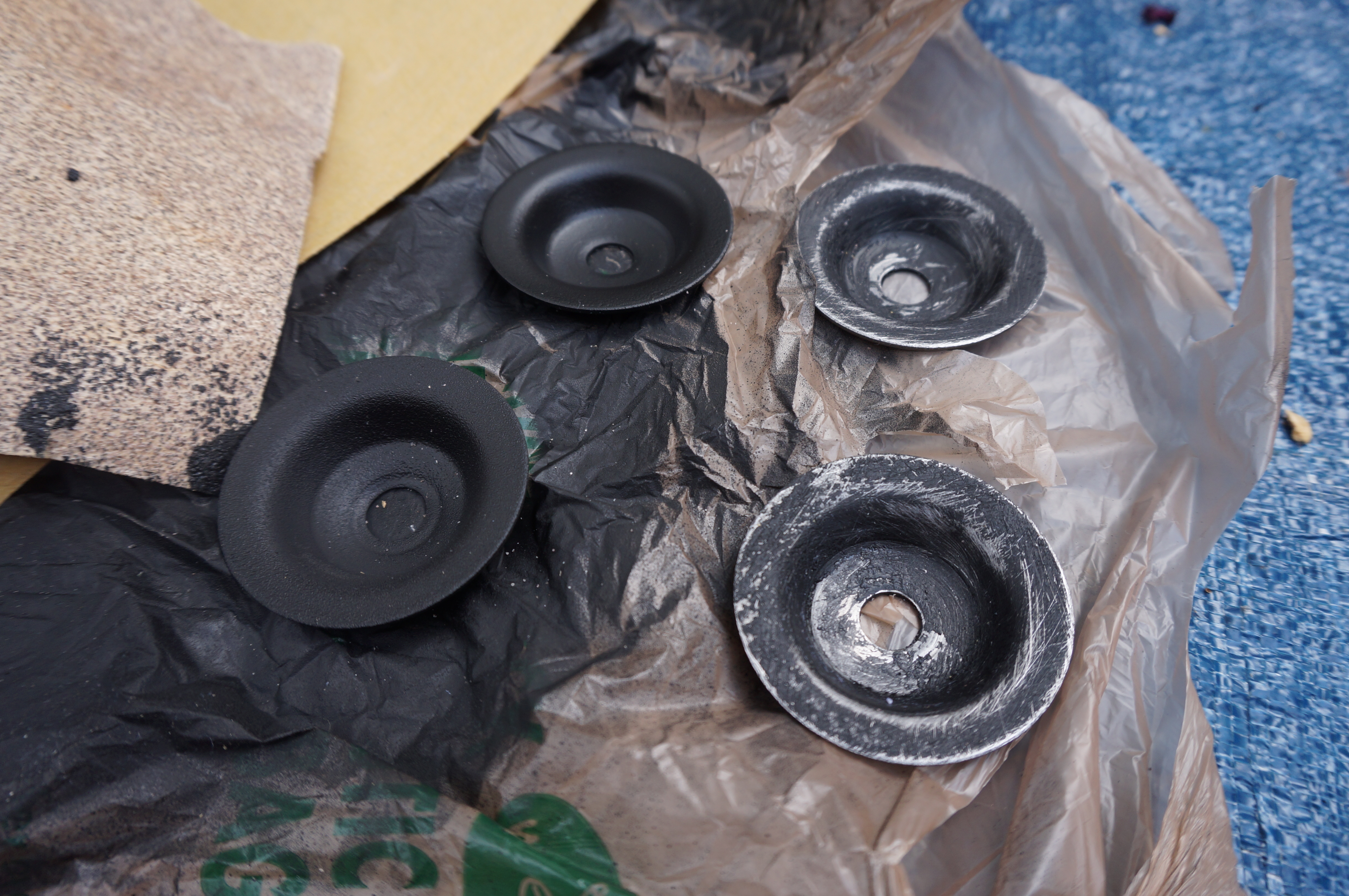 Remember those metal bots from Step 1? I dug those out again and spray painted them black, then rubbed them a bit with some sandpaper when they were almost dry but not quite. I returned them to their original place on the spool pallet. (Update: I only used four of the six bolts in the end because I liked the look of having two open holes in the middle!)