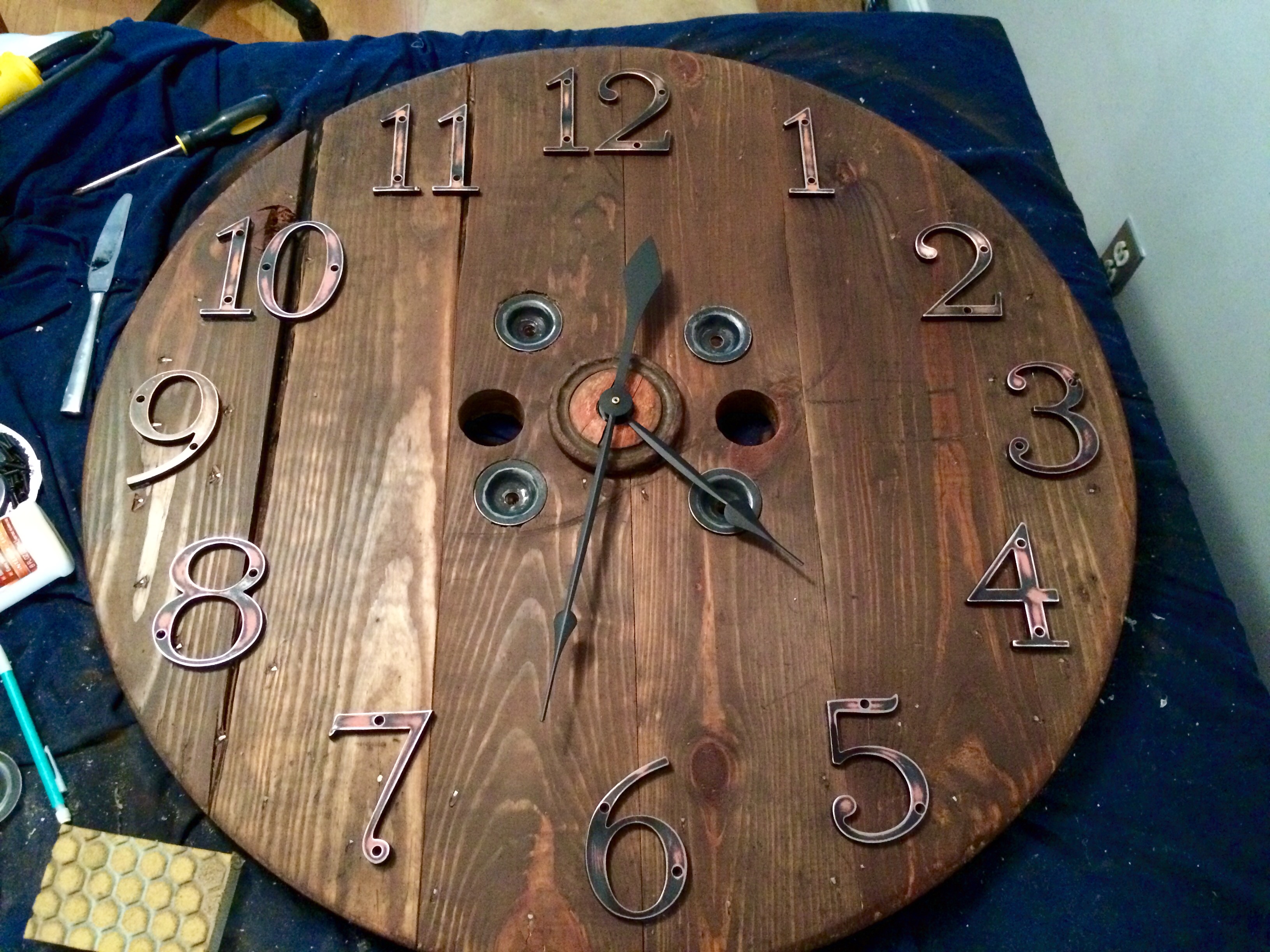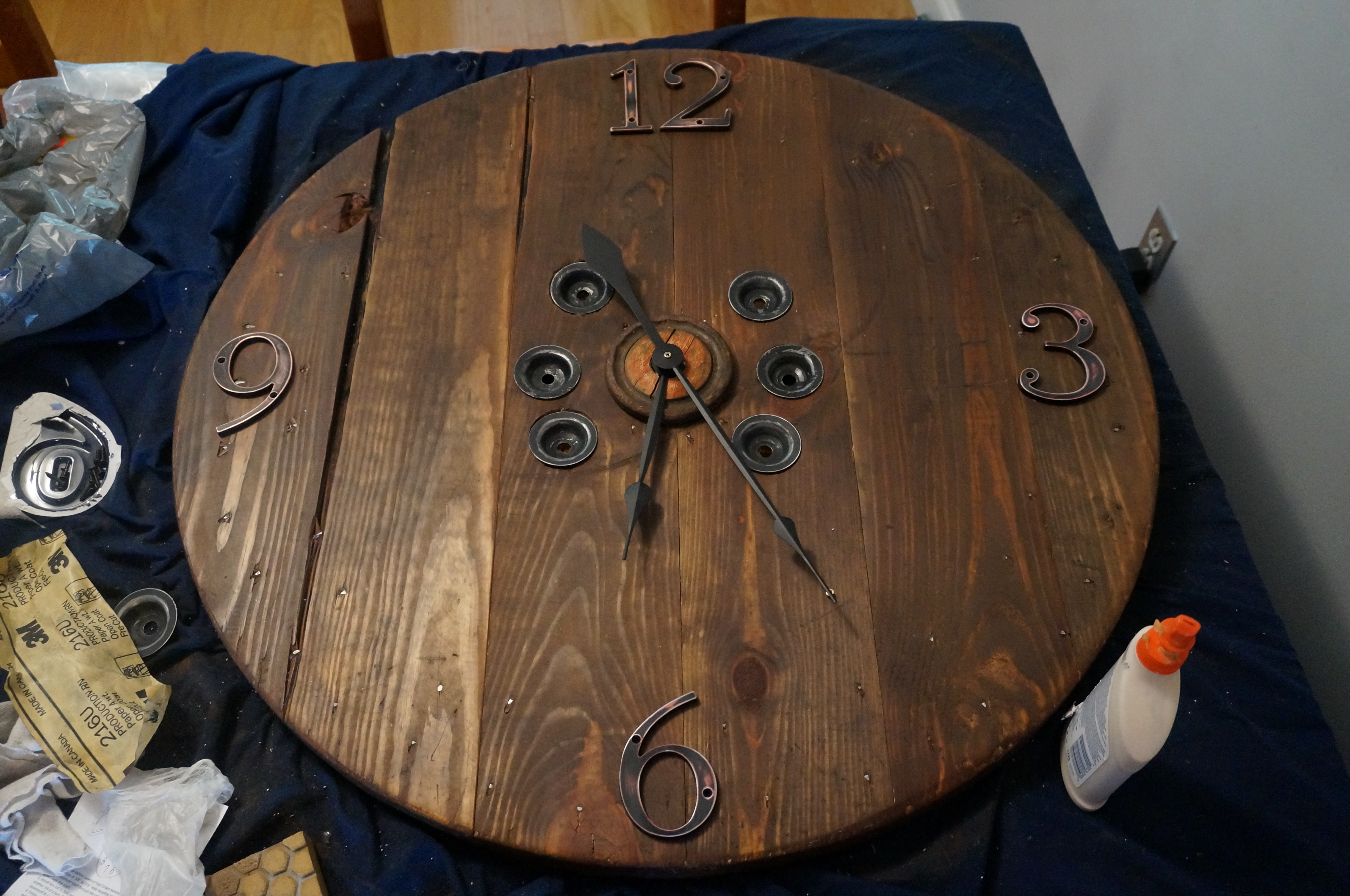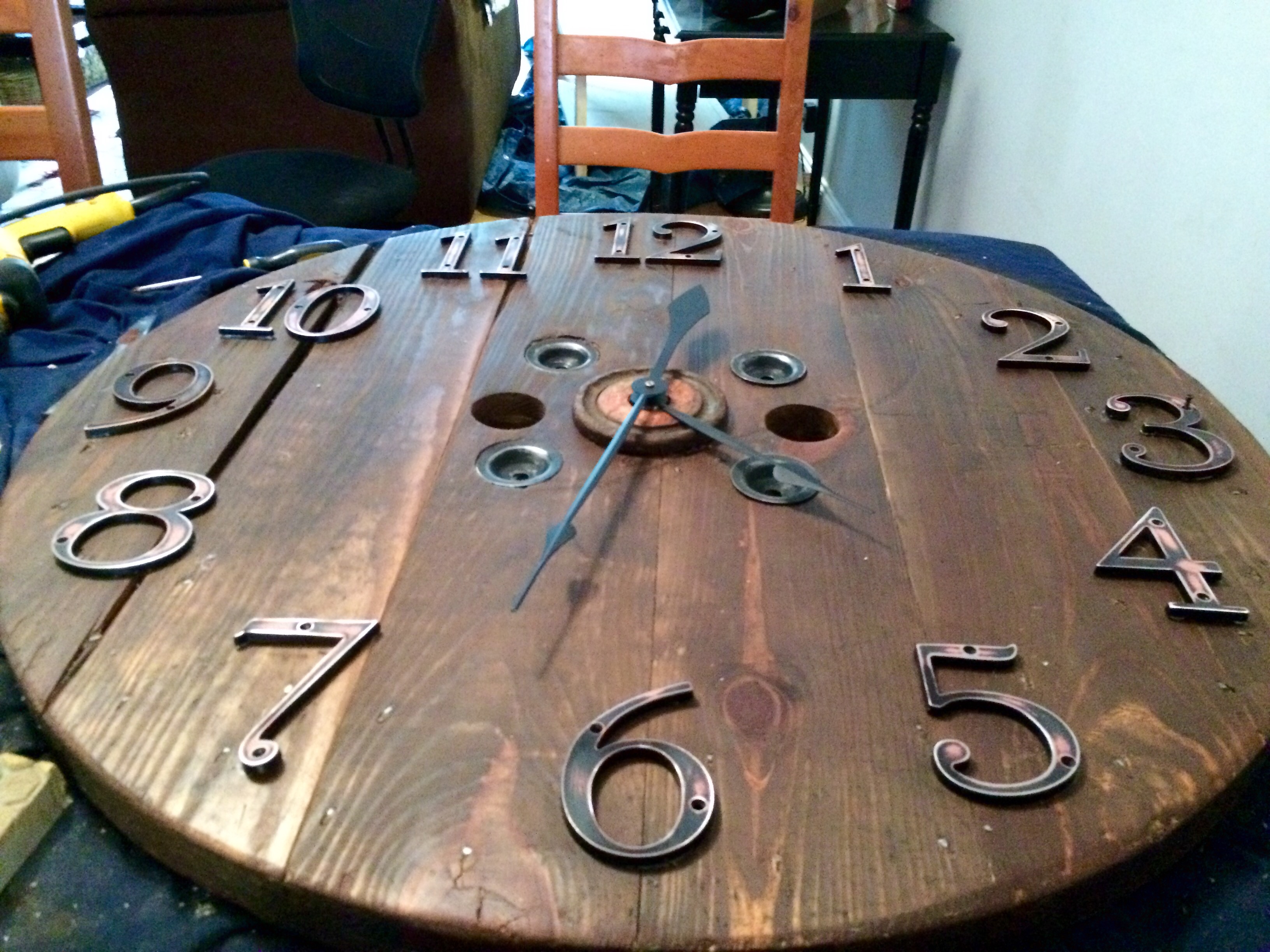 I don’t think this pallet was a perfect circle, nor is it perfectly level, so this was quite the challenge! I waited about two days with the clock battery inserted in order to see exactly where the minute and hour hands would point, and I used that to glue the remaining numbers down one-by-one with hot glue. After I was pleased with the location of all the numbers and the clock was actually telling time correctly, I used drill (yay, power tools!) to drill in the screws that came with the numbers for stability. I found that the hot glue actually wasn’t the most stable and the numbers kept coming loose, so I think the screws were a good choice.