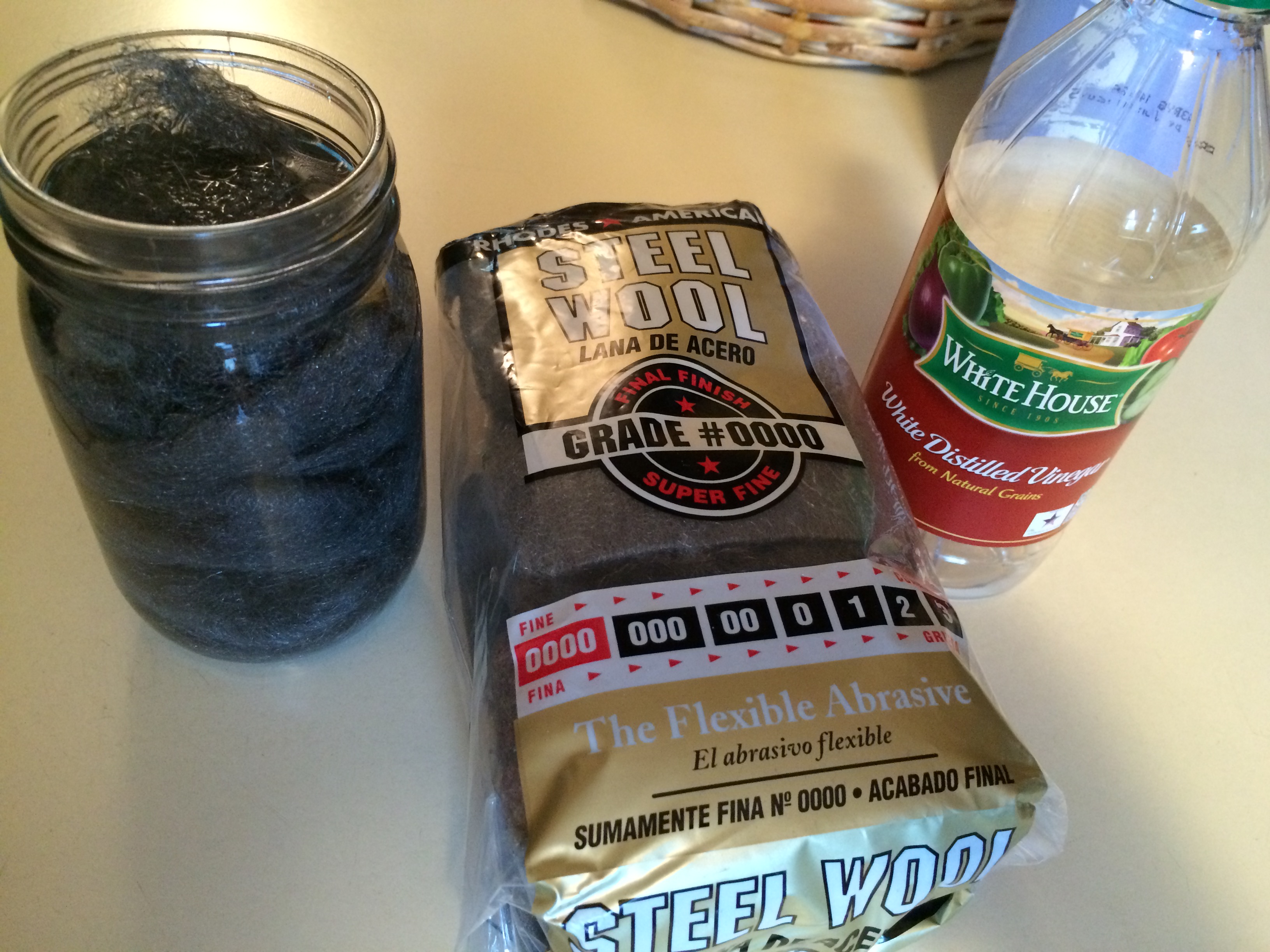 Next, I prepared the oxidizing solution of steel wool and vinegar. I just tore off a big piece of steel wool and stuck it in a jar with a bottle of white vinegar, then let it sit for a few days on the counter, shaking every day or so. The wool won’t completely dissolve, so don’t look for that to happen if you try this. It should bubble like crazy though! Also, I’ve heard that using a jar with a metal lid is important for this step. I don’t know what happens if you don’t, but I decided to follow directions.