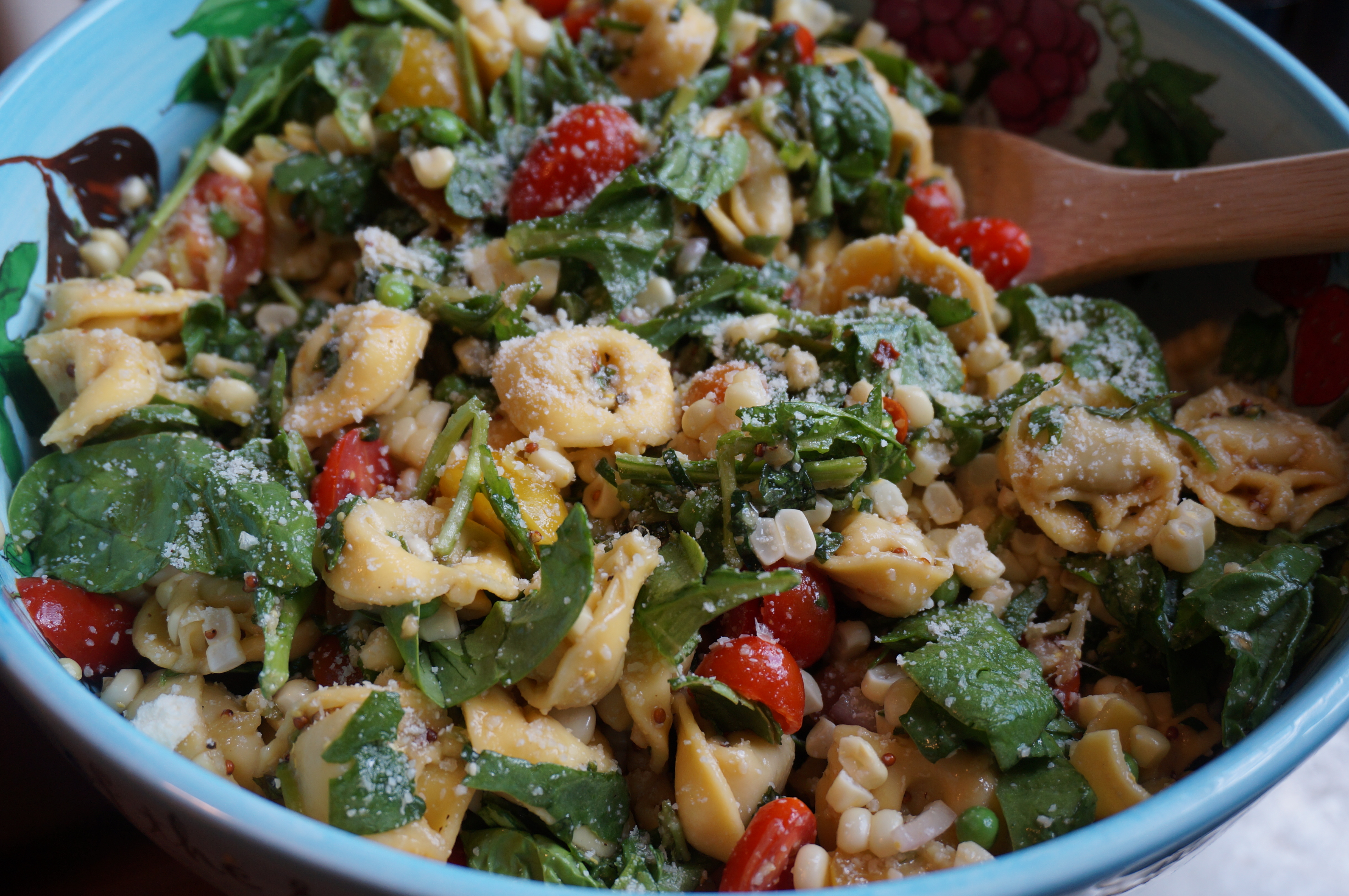 Heat aside, there are still a bounty of fresh veggies at the farmers’ market and grocery store, and I took advantage by making this super easy tortellini salad with some fresh corn, tomatoes, and basil from our herb garden. I tossed it with a bit of spinach, parmesan cheese, and homemade vinaigrette and called it a day. It was the perfect light supper for me, served with my leftover fish from Bleu Olive. Ben got steak. π