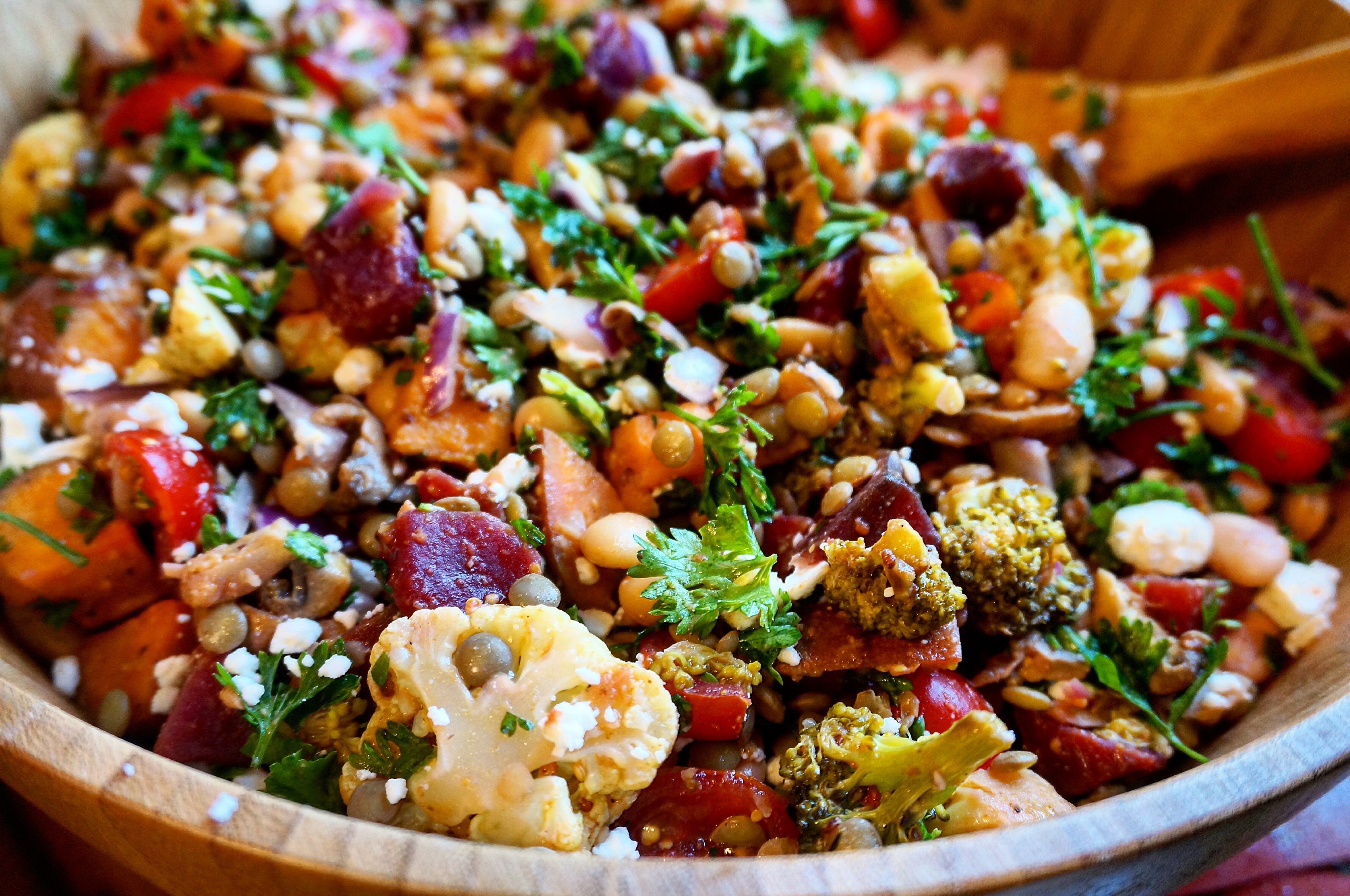 - Combine the white beans, beets, broccoli/cauliflower, and mushrooms. Add the sweet potatoes (they should be almost cooked through). When oven is preheated, pour half of the vinaigrette over the vegetables and spread on a Silpat- lined baking sheet. Cook 20-25 minutes or until tender.