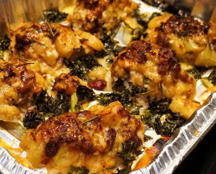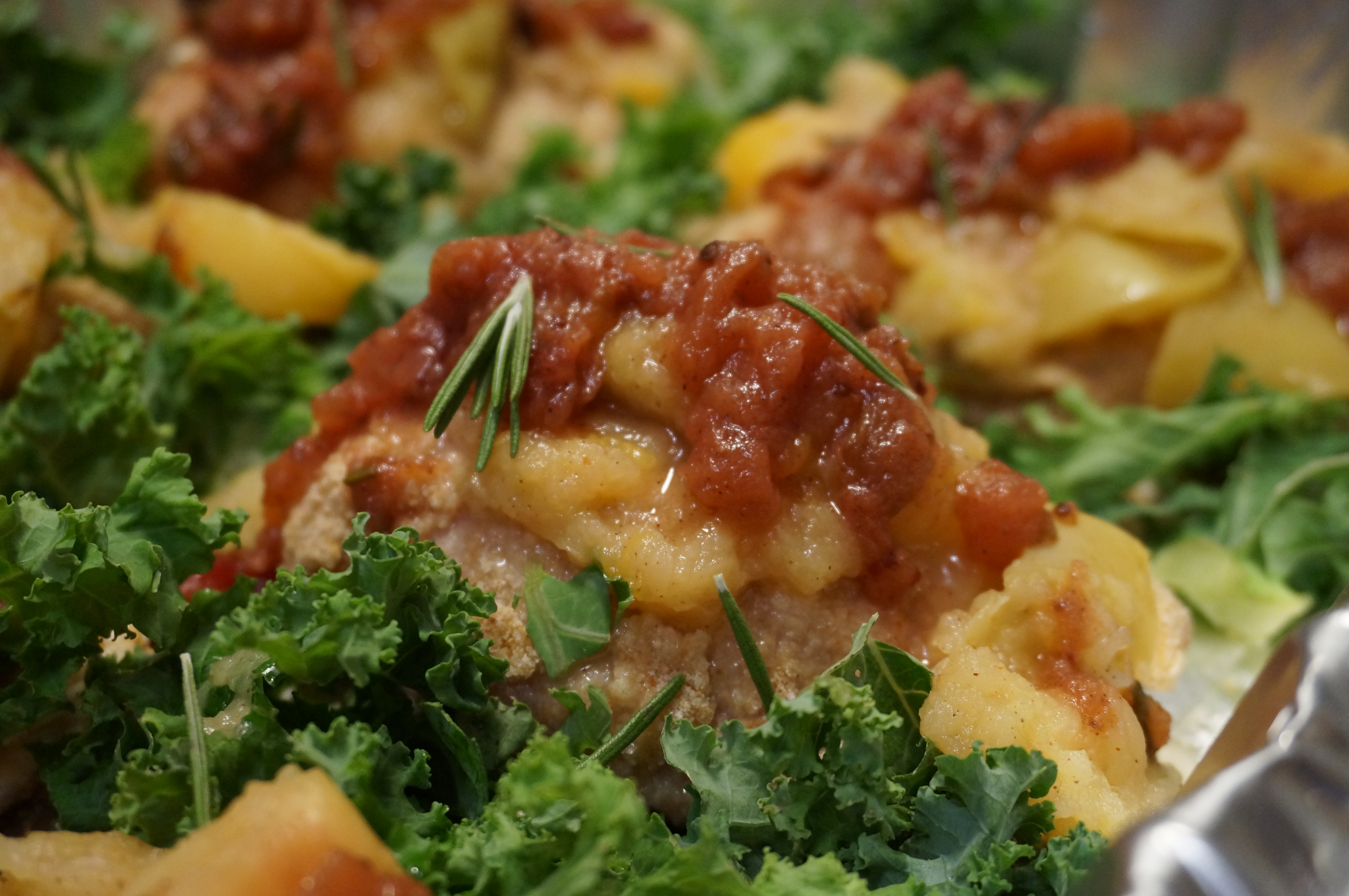 Since dinner was being prepped at the same time, I just used some of the applesauce mixture (about 30 min into the cooking process) to ladle over these breaded chicken breasts. I also added a little dollop of apple salsa from a few weeks ago (which I had gotten a chance to freeze some of, luckily!), kale, and sharp cheddar cheese.
