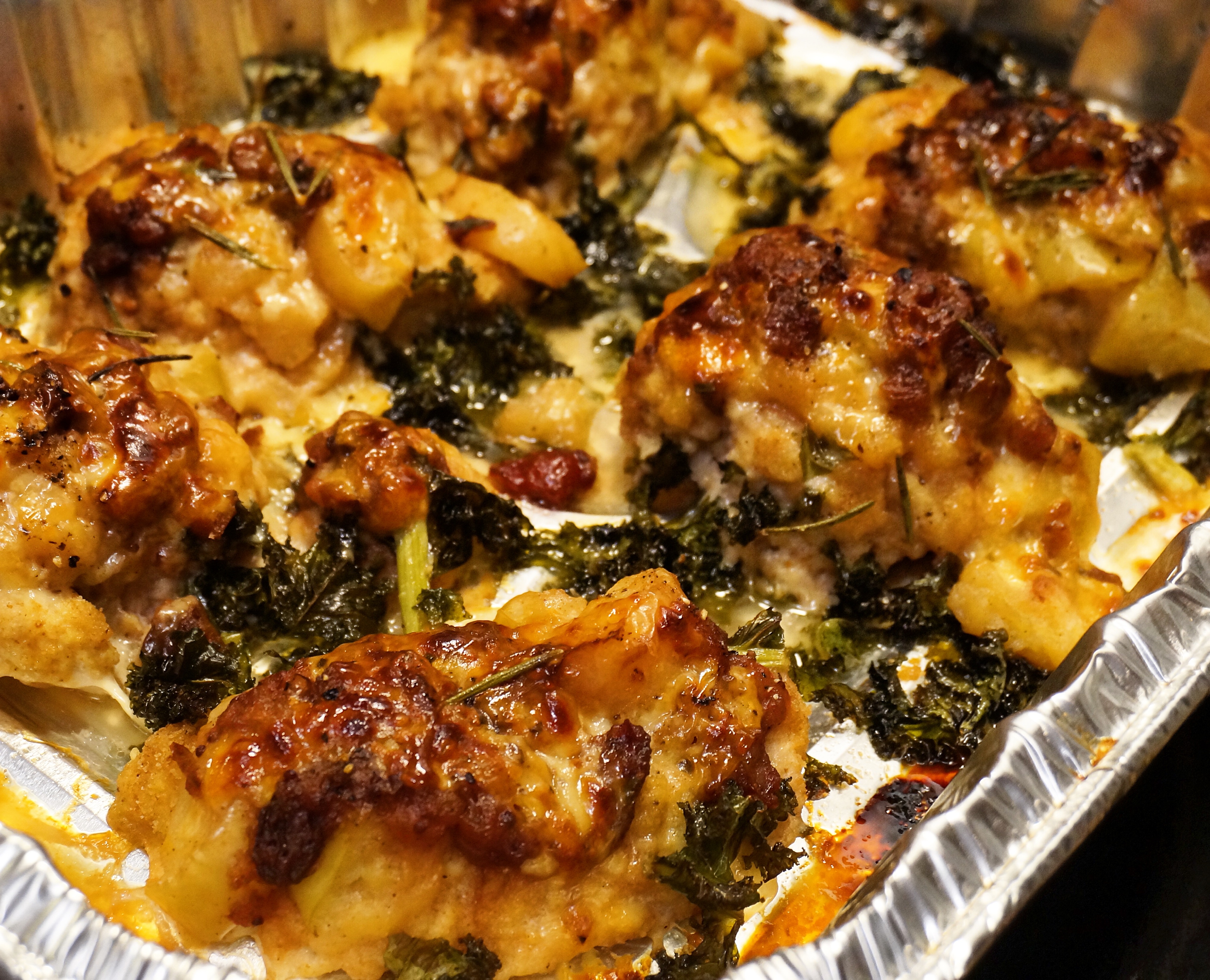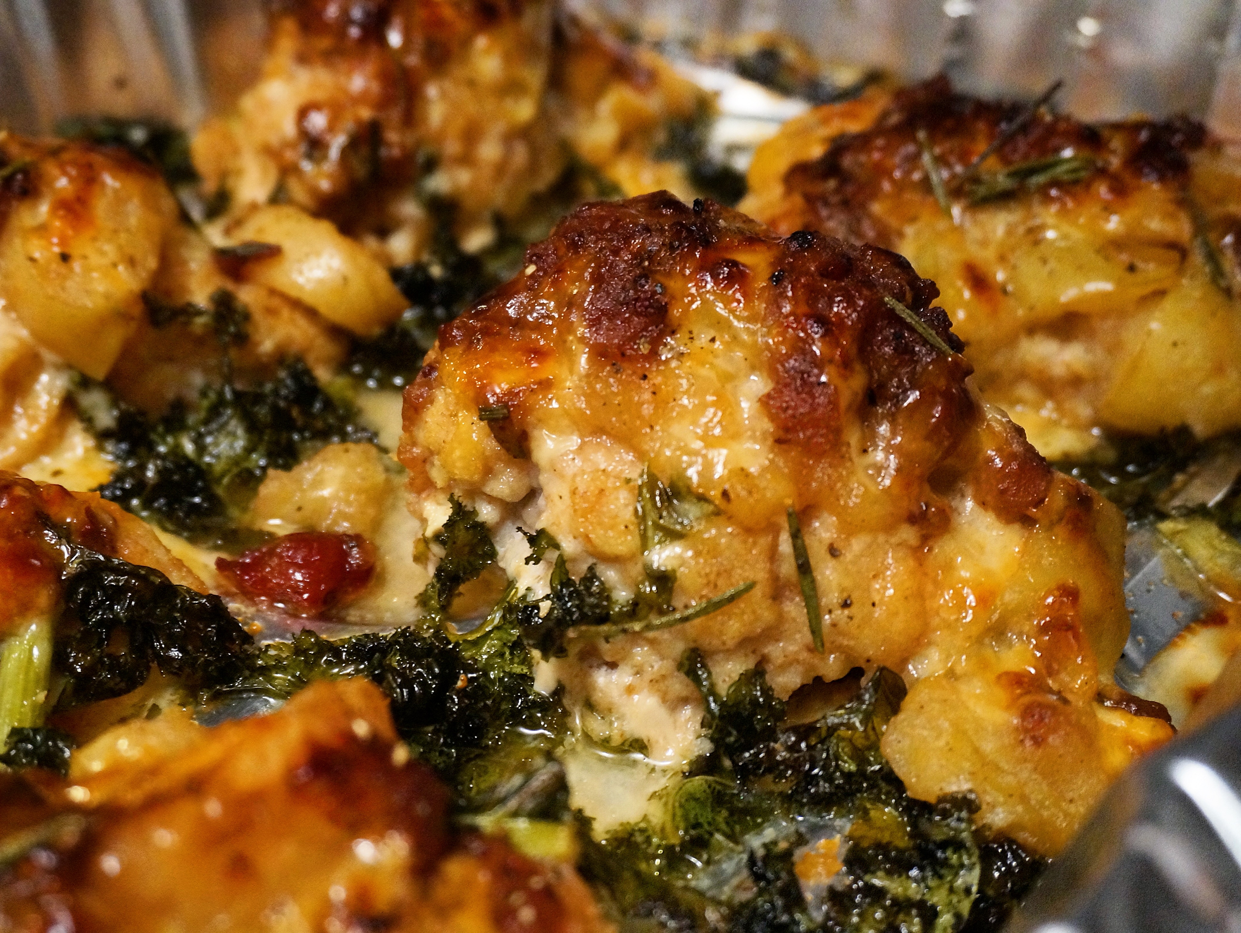 - Dredge defrosted chicken breasts in flour, followed by egg mixture. Shake of excess and dredge both sides in breadcrumbs. Place in a large casserole pan sprayed with cooking spray. Sprinkle kale in between chicken breasts and spray with olive oil or cooking spray.