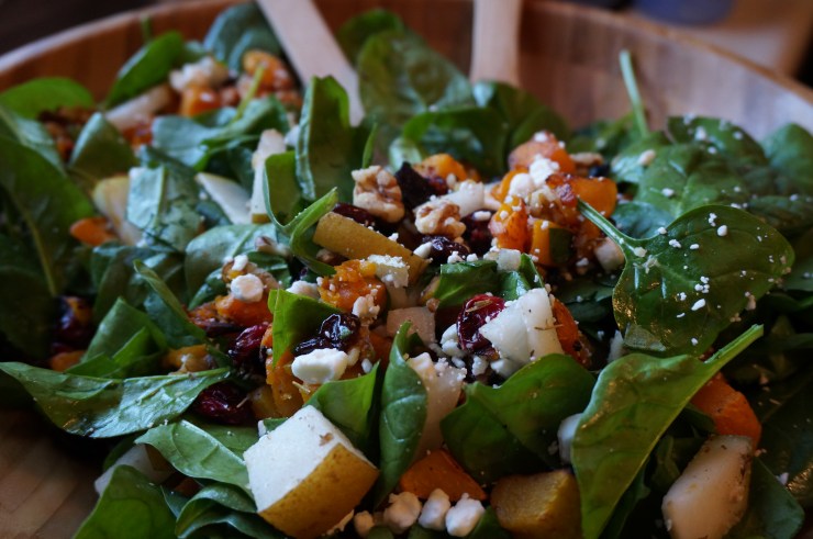 Hey, two posts in two days! (Soon to be three in three- keep an eye out for my sweet potato empanadas tomorrow!) You lucky ducks. I’ve been slaving away in the kitchen all day preparing empanadas and salad to bring to our friends’ annual Friendsgiving. Looking at the list and seeing a long column of heavy casseroles and about six different versions of stuffing (all delicious, don’t get me wrong!), it seemed like a nice green salad was missing. Inspired by fall flavors and colors, I settled on a roasted butternut squash and cranberry spinach salad with dried cherries, walnuts and goat cheese.