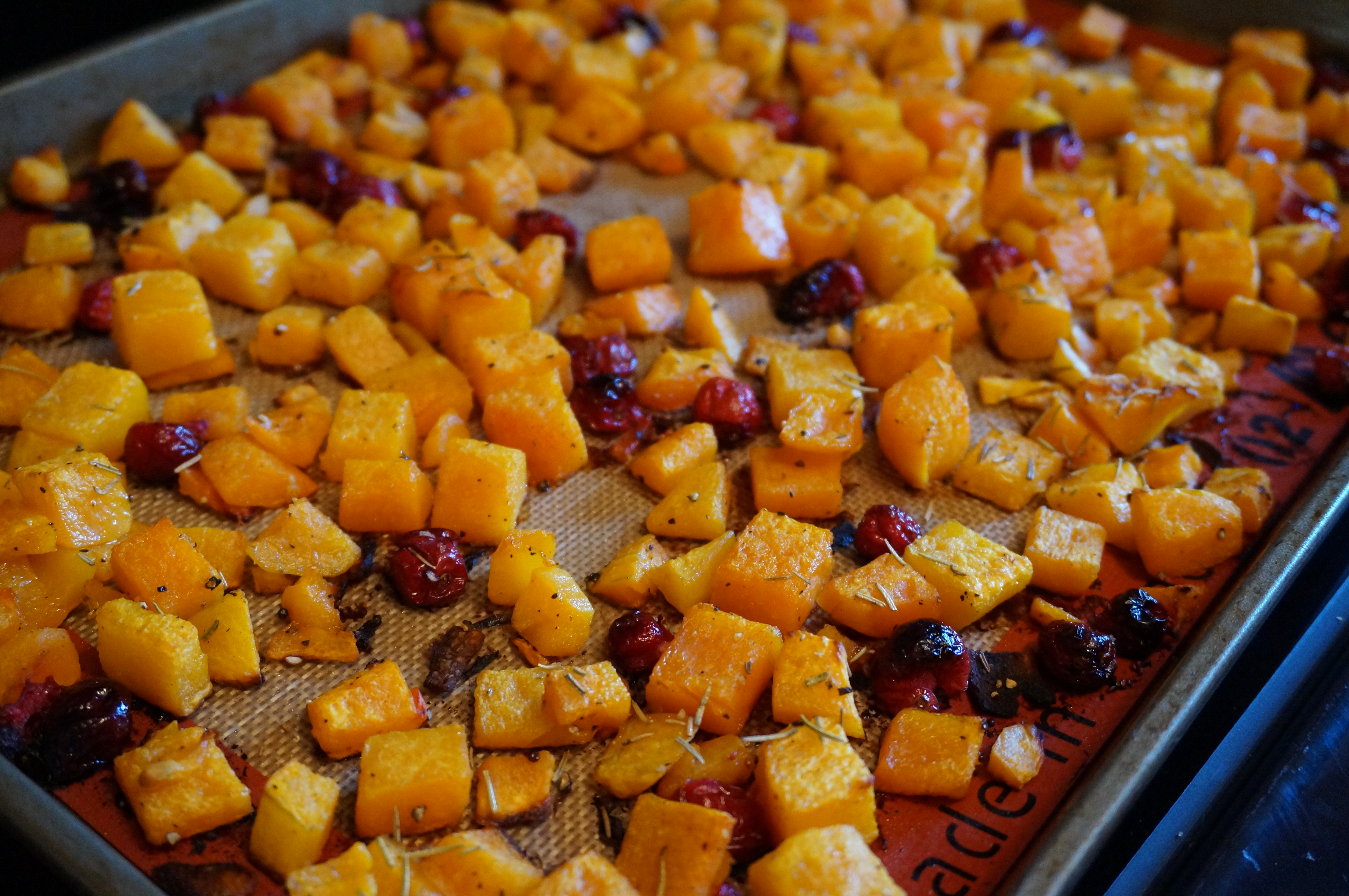 - Spread butternut squash and cranberries on a large cookie sheet and drizzle with olive oil, rosemary, salt and pepper. Toss to combine.