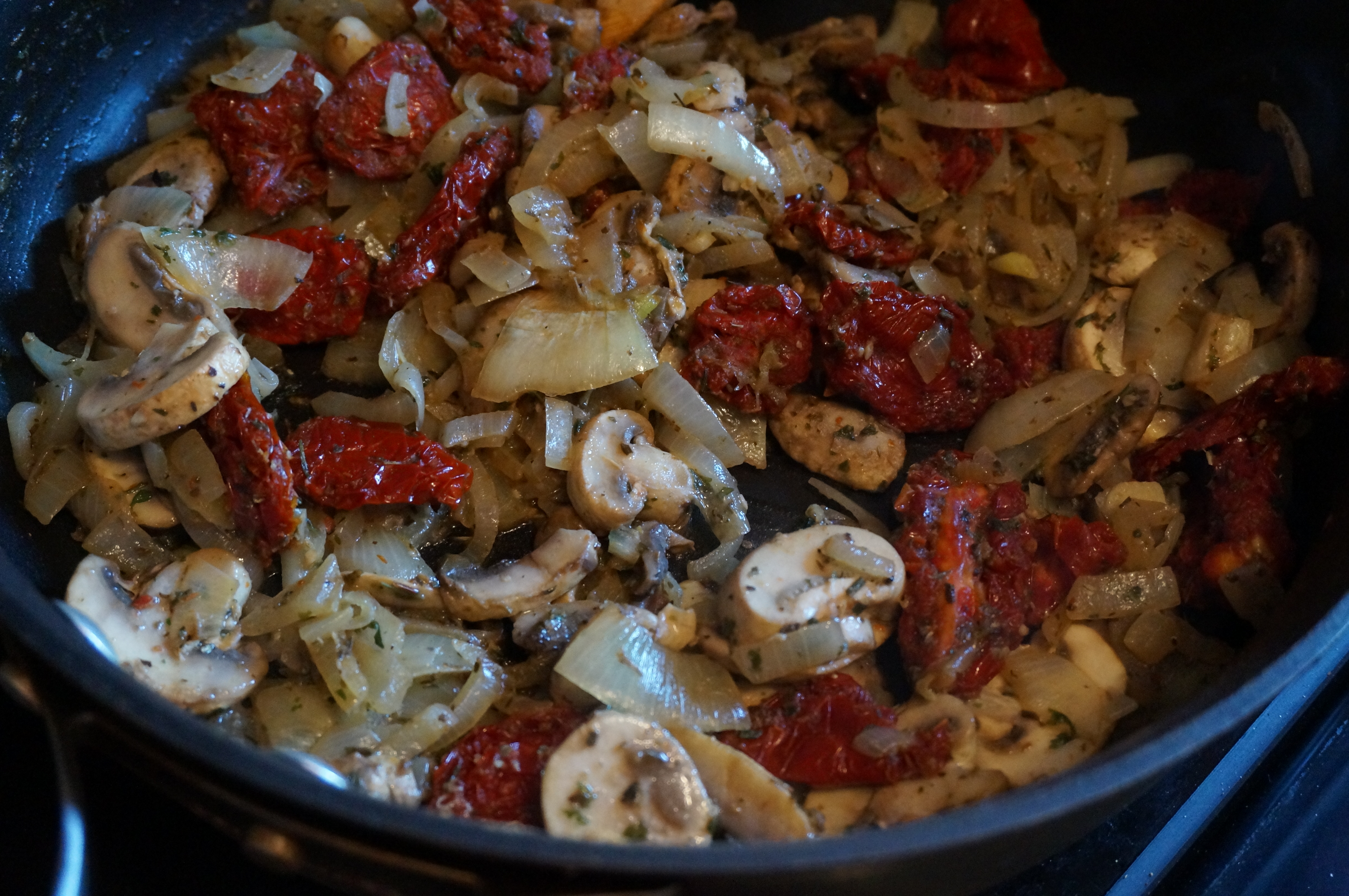 - Heat 2 T olive oil in a large pan over medium-high heat. Add chopped onions, mushrooms, garlic, thyme, parsley, S+P, and cook for 3 minutes or until tender.