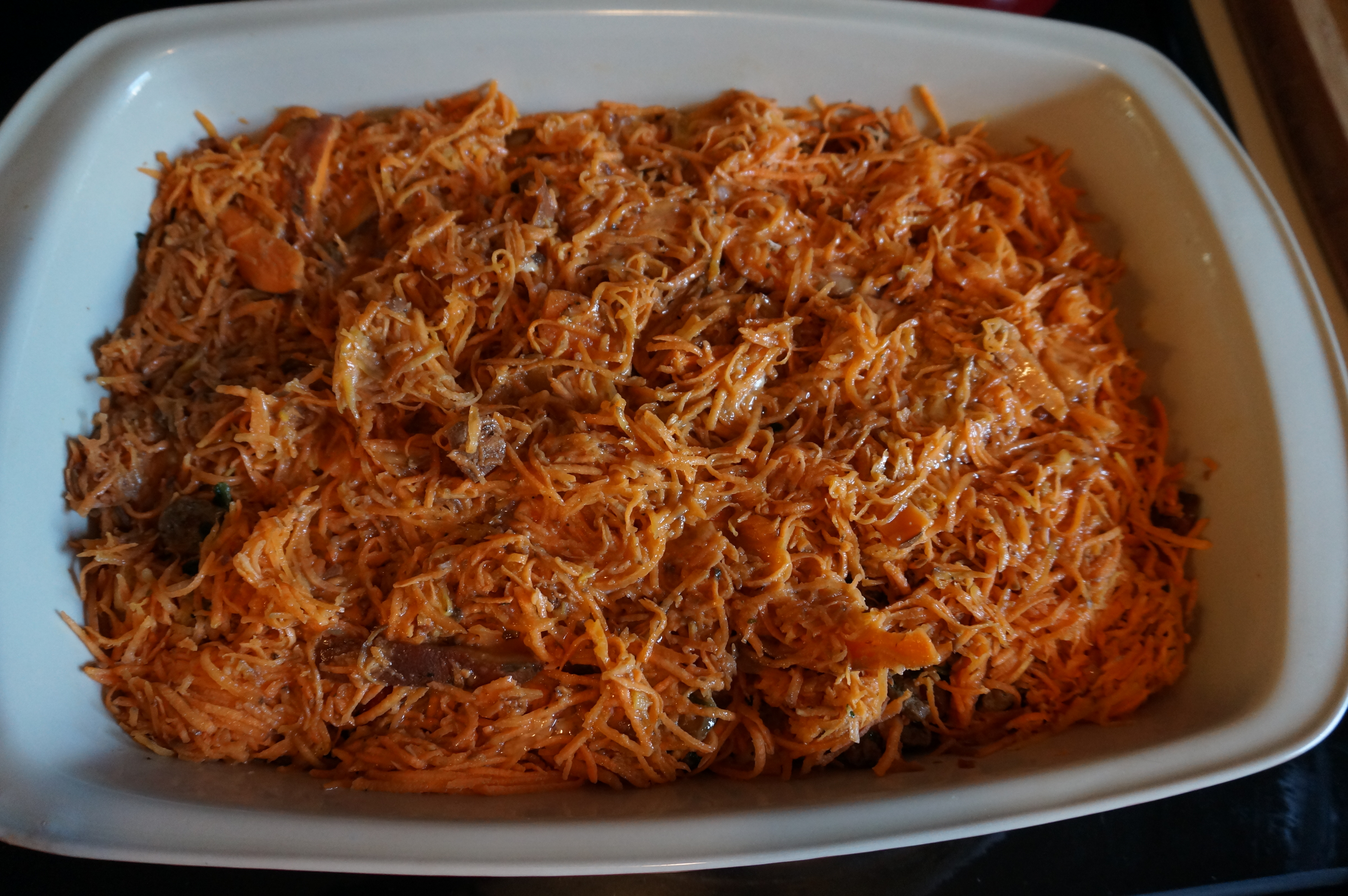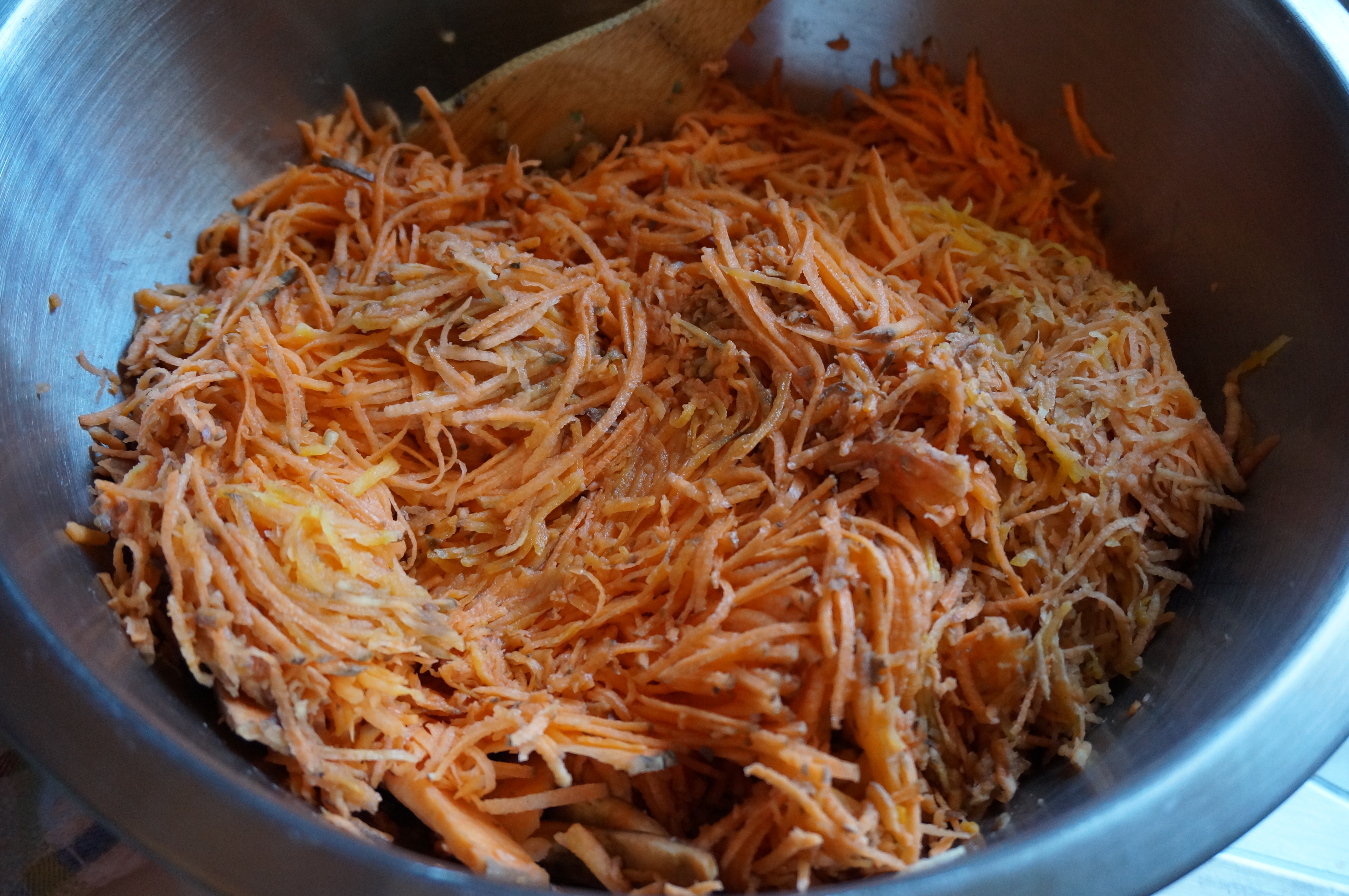 - In a food processor set to shredding setting, shred sweet potatoes to medium-fine thickness. Pour into a large bowl and stir in remaining 2 T olive oil. Spread in an even layer over the top of the sausage.