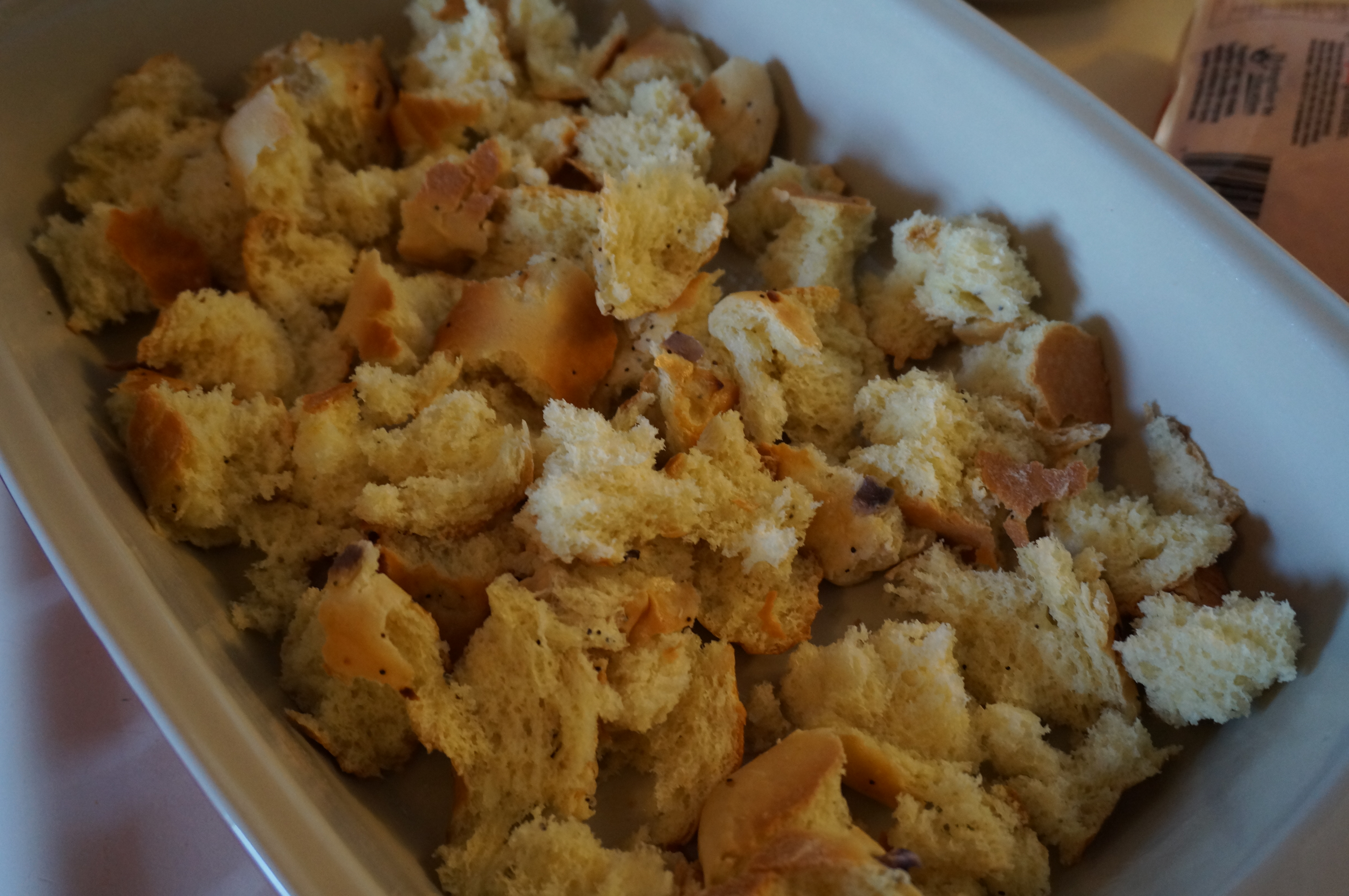 - Pour egg mixture evenly over potatoes in dish, shaking dish a bit to make sure it’s evenly distributed (I also sometimes press down the casserole to make sure the bread gets saturated).