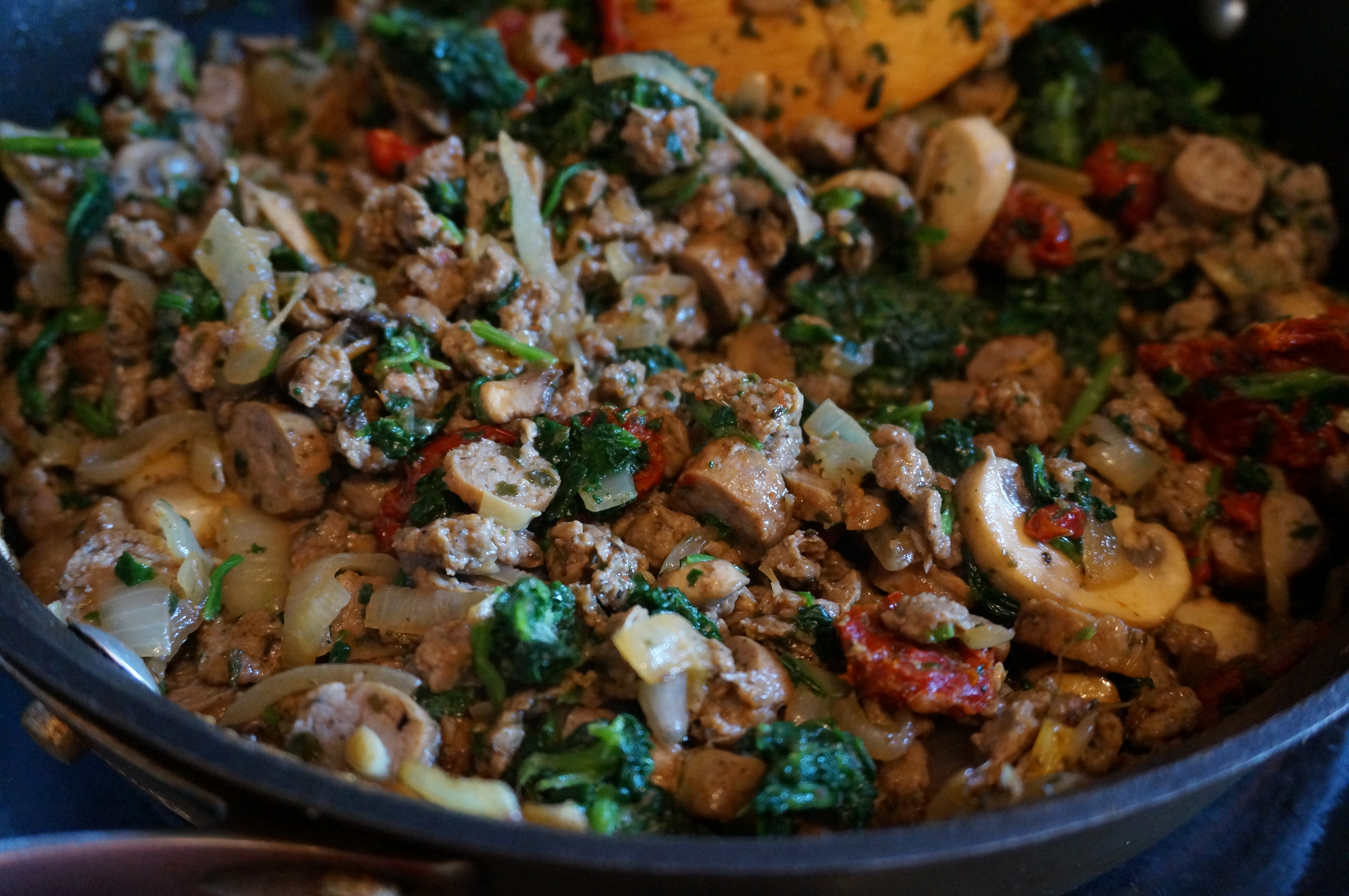 Of course, I made it as gourmet as I could. Sun-dried tomatoes and all! I kept things easy with some pre-cooked turkey sausage and frozen spinach, day-old bakery buns, and un-skinned (but very washed!) sweet potatoes.
