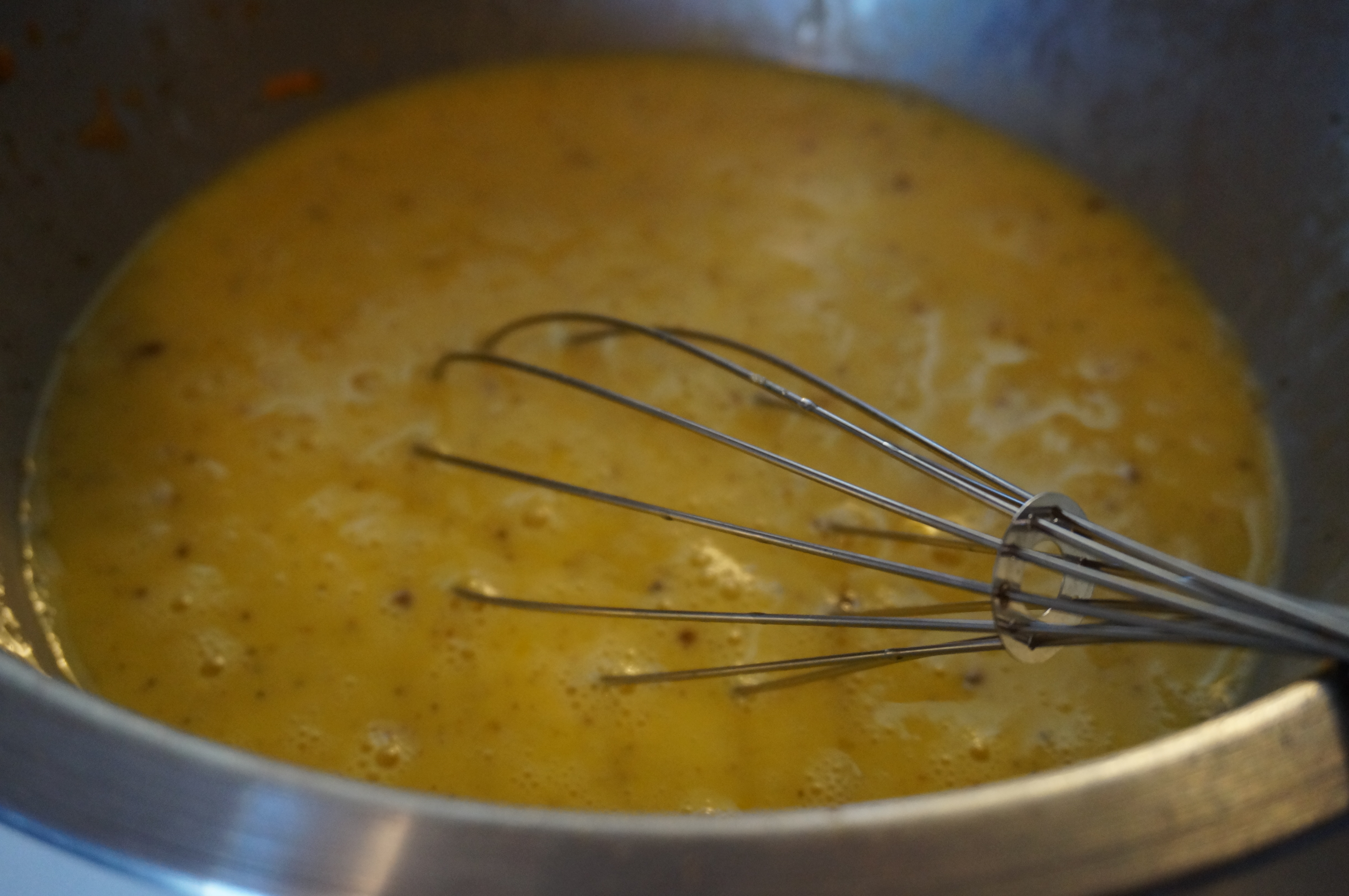- In same bowl, whisk together eggs, milk, nutmeg and garlic powder.