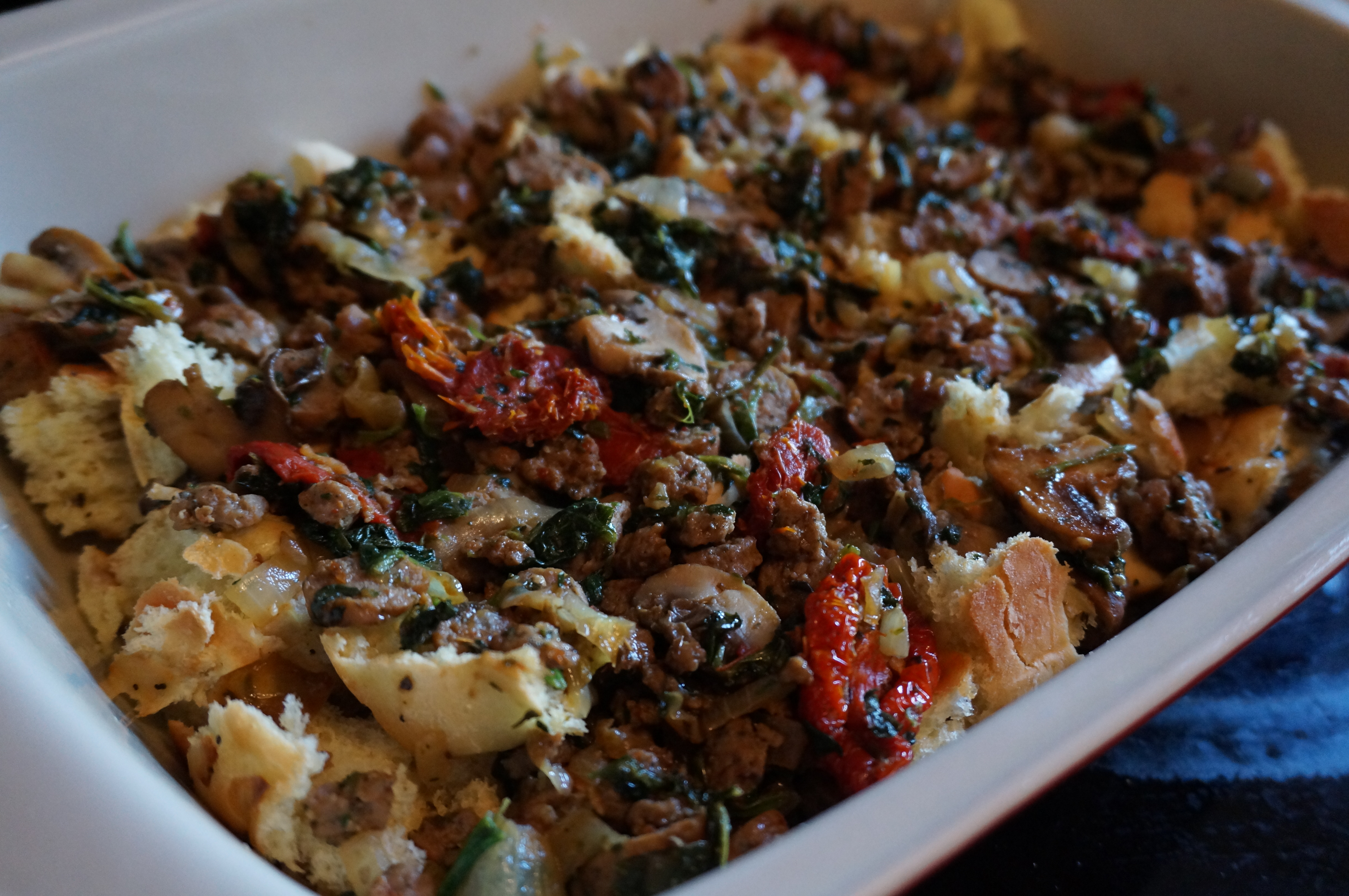 - Stir in frozen spinach, tomatoes, and turkey sausage and cook for 2-3 more minutes until spinach is heated through. Pour over the bread in casserole dish.