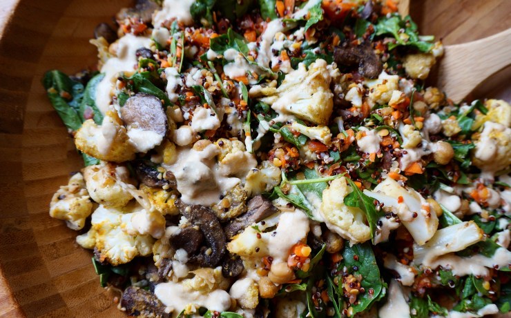 - Add the chopped veggie mixture to a large bowl and toss with spinach and the cooked grains. Top with roasted cauliflower mixture and sprinkle on additional nutritional yeast if desired.