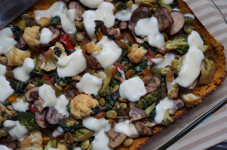 This sweet potato crust pizza is super easy and adaptable to whatever odds and ends you have on hand! I imagine it would be really tasty with pinch of yum’s BBQ toppings, or traditional marinara. I didn’t have either one available, so I chose a tahini dressing to drizzle over the top! I also topped it with some pumpkin spiced pumpkin seeds I picked up at Trader Joe’s (don’t judge me- I didn’t realize they were PS until after I got home and PS is still NOT ok).