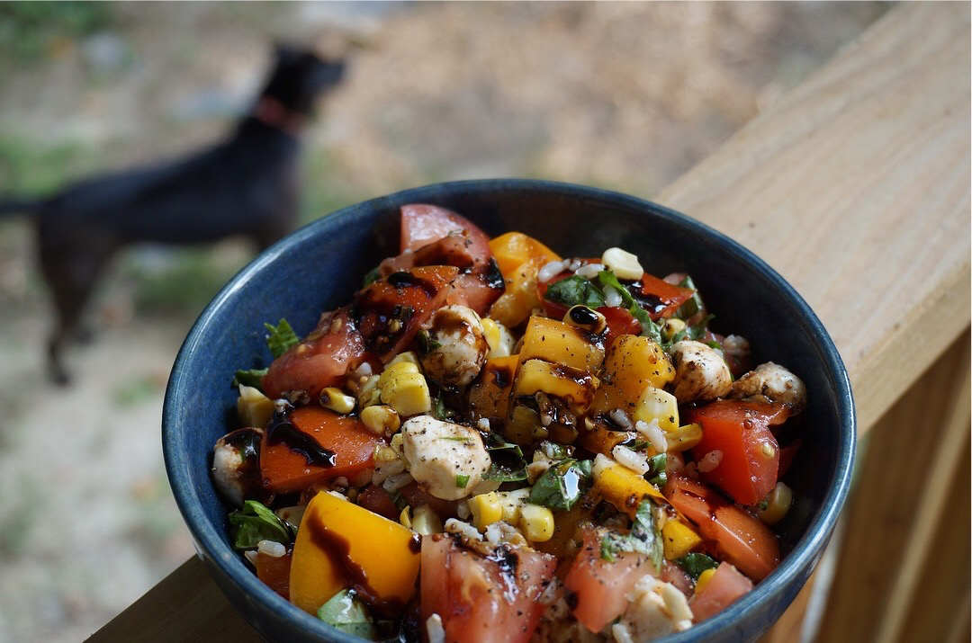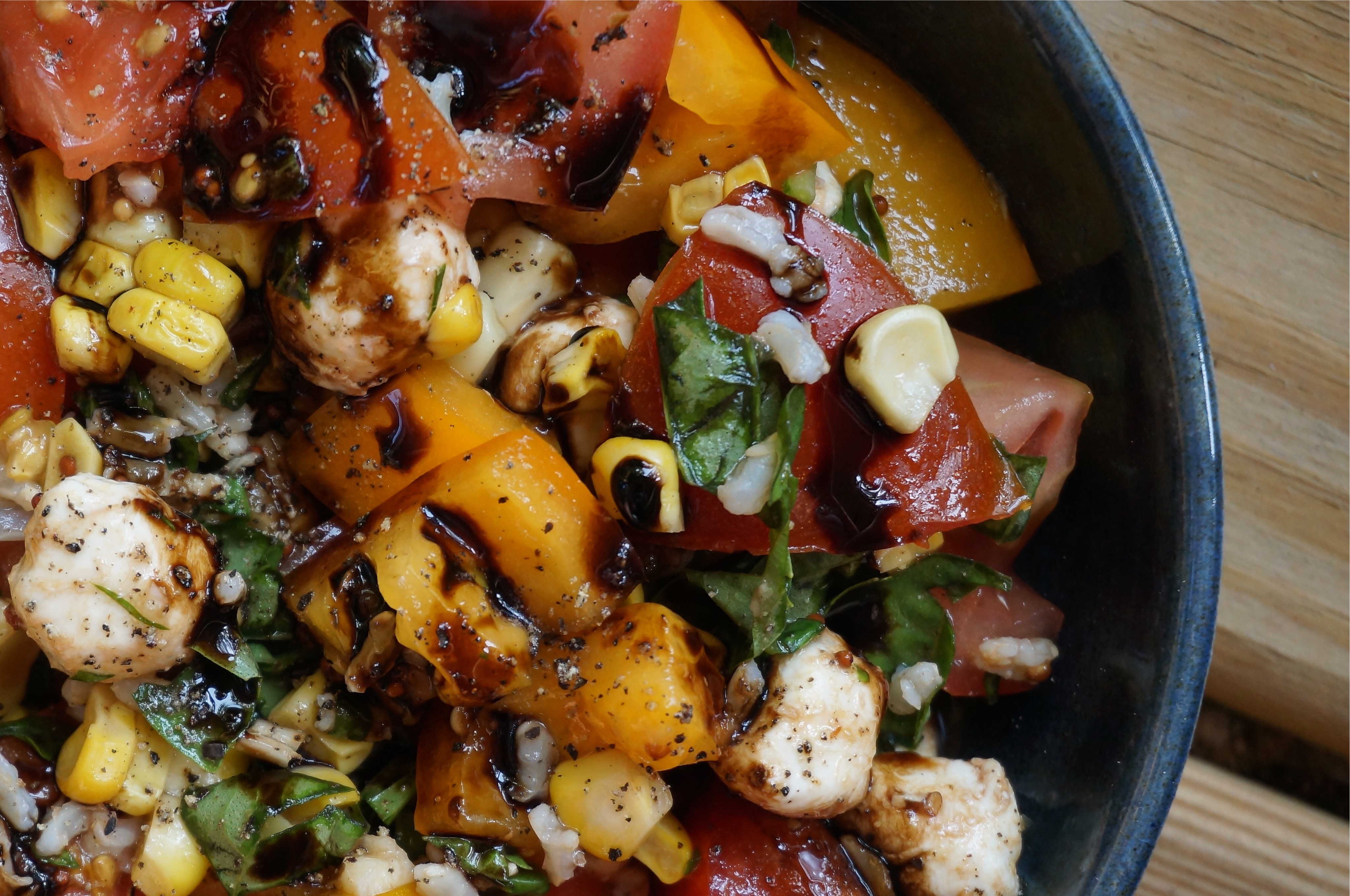 Happy July! The summer is rolling in FAST and that means HOT. After spending our afternoon at an outdoors event last night, I was craving something cool and light. I had a few extra tomatoes on hand and some balsamic glaze that I had picked up at TJ’s (sample stand impulse buy, anyone?) so this salad basically made itself. I threw in some leftover corn from the other night and also some brown rice to bulk it up a bit.