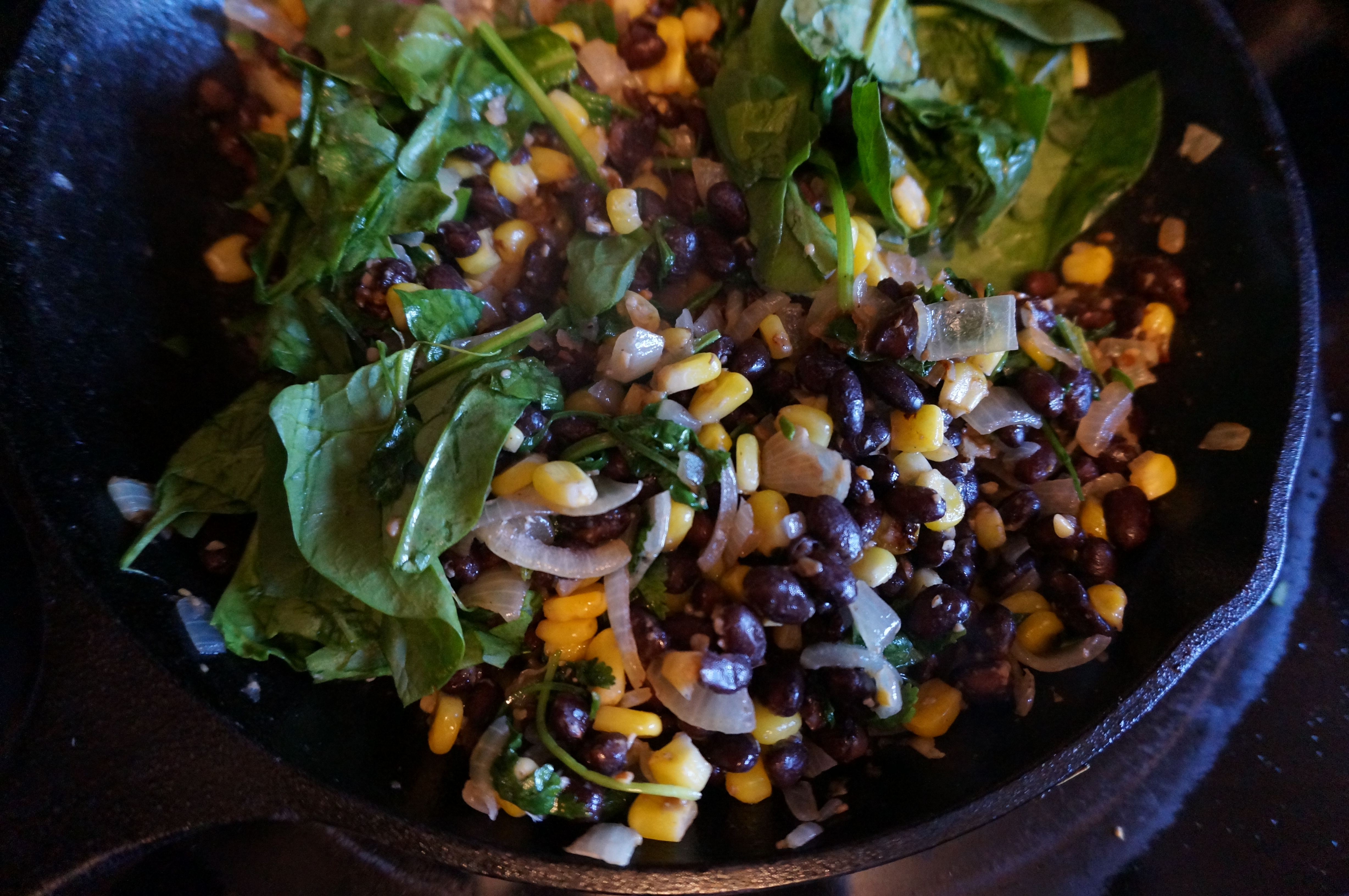 - In a large casserole dish, layer hummus, quinoa/lentils, swiss chard, roasted tomatoes and carrots, and crispy chickpeas/cauliflower. Top with kalamata olives, feta and cilantro.