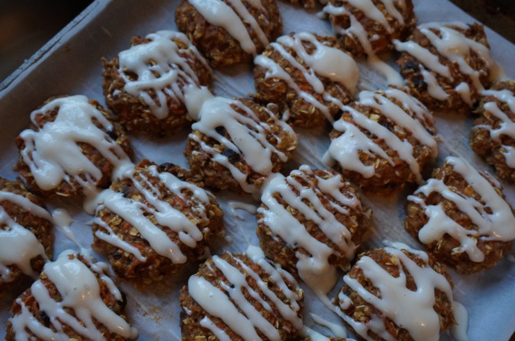 To make these a little more “desserty” (and also more like true carrot cake), I whipped up a cream cheese glaze to drizzle over the cookies when ready to serve. The glaze will harden slightly as the cookies continue to cool, but will stay drizzly, not like the gross frosted molasses cookies you buy in a box.